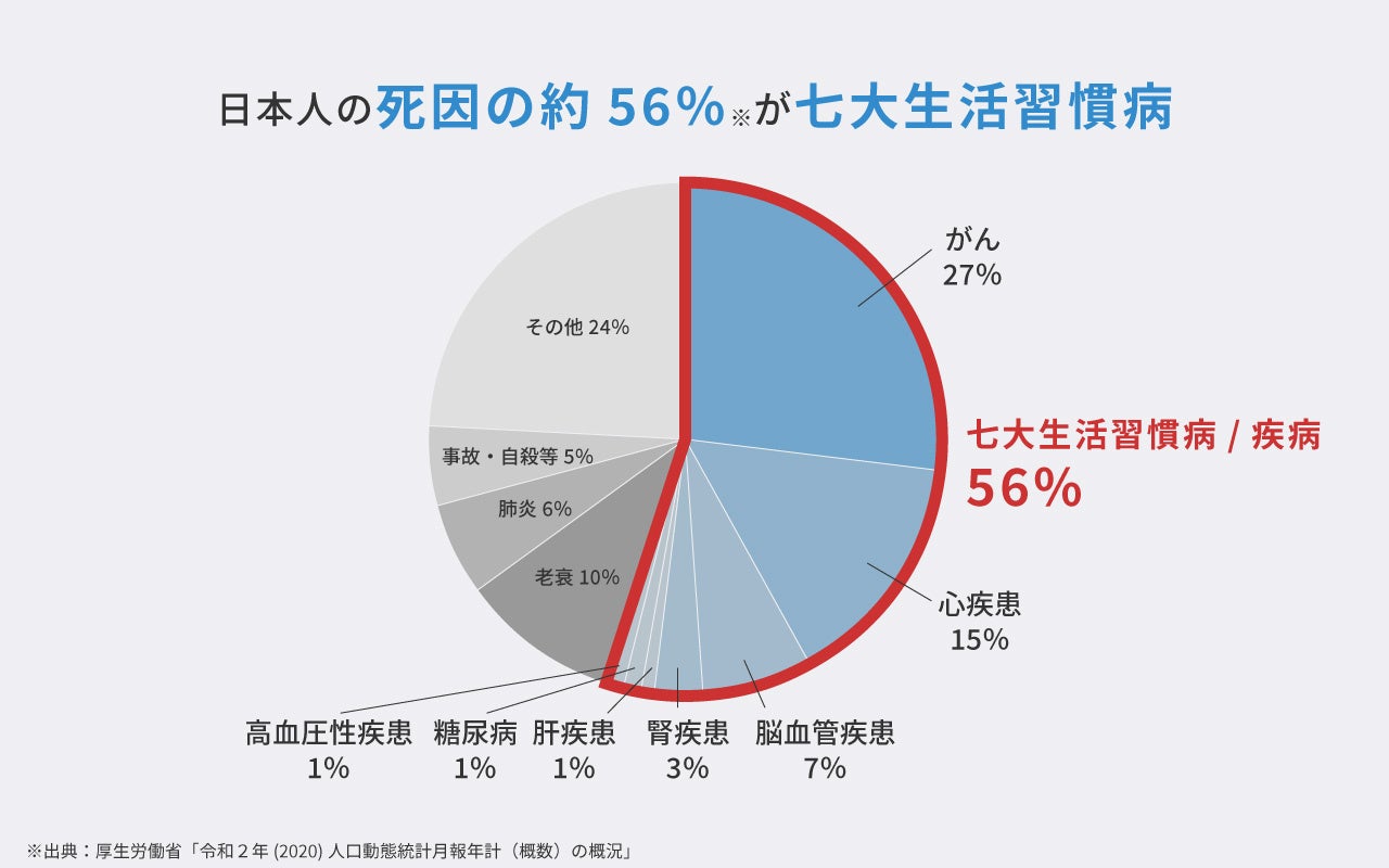 七大生活習慣病には、がん、脳卒中、心筋梗塞、高血圧性疾患、糖尿病、肝硬変、慢性腎不全が含まれ、これらの予防は特に働き盛りの世代にとって非常に重要です。初期の生活習慣病には自覚症状が少なく、知らぬ間に病気が進行してしまうリスクがあります。進行した生活習慣病は重篤な症状を引き起こすことが多く、定期的な検査で自身の健康状態を把握し、リスクを早期に発見することが大切です。+αは、昨今流行している感染症等に対応していきます。
