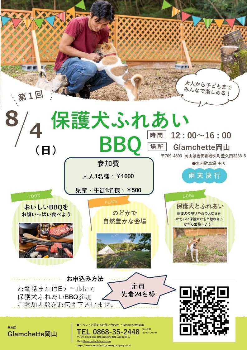 保護犬と共にグランピングができる、Glamchette岡山(所在地:岡山県勝央町、代表:東谷 有紗、読み:グランシェットおかやま)は2024年8月4日(日)、岡山県内の小学校および養護学校の生徒に向け、保護犬とバーベキューを楽しむイベント「保護犬ふれあいBBQ 〜保護犬の現状を知り、命の大切さを学ぼう〜」を開催いたします。