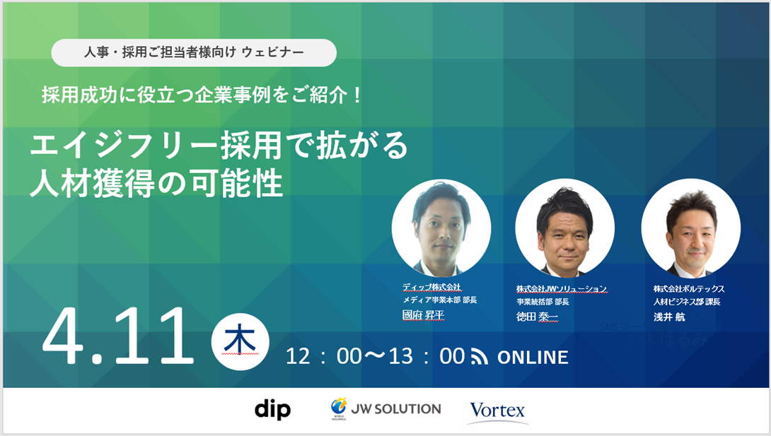 株式会社JWソリューション(本社所在地:東京都港区東新橋2丁目14-1 NBFコモディオ汐留 代表取締役:工藤洋)が、株式会社ディップ(本社所在地:東京都港区六本木3-2-1 六本木グランドタワー31F 代表取締役:冨田 英揮、志立 正嗣)、株式会社ボルテックス(本社所在地:東京都千代田区富士見2-10-2 飯田橋グラン・ブルーム22F 代表取締役:宮沢 文彦)と3社共催で2024年4月11日(木)にウェビナー『エイジフリー採用で拡がる人材獲得の可能性』を開催いたします。