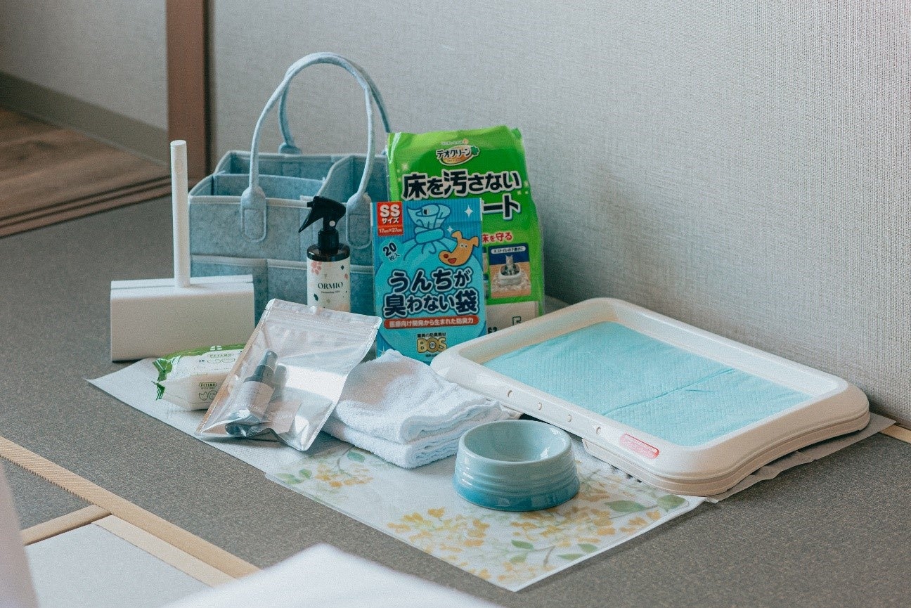 お部屋の畳はわんちゃんの爪が引っかかったり、粗相をしてしまった際に畳に染み込まない様、専用の畳を使用しております。また消臭袋・消臭剤・コロコロ、ウェットティッシュなど、衛生面に配慮した小物も全てのお部屋に設置しております。