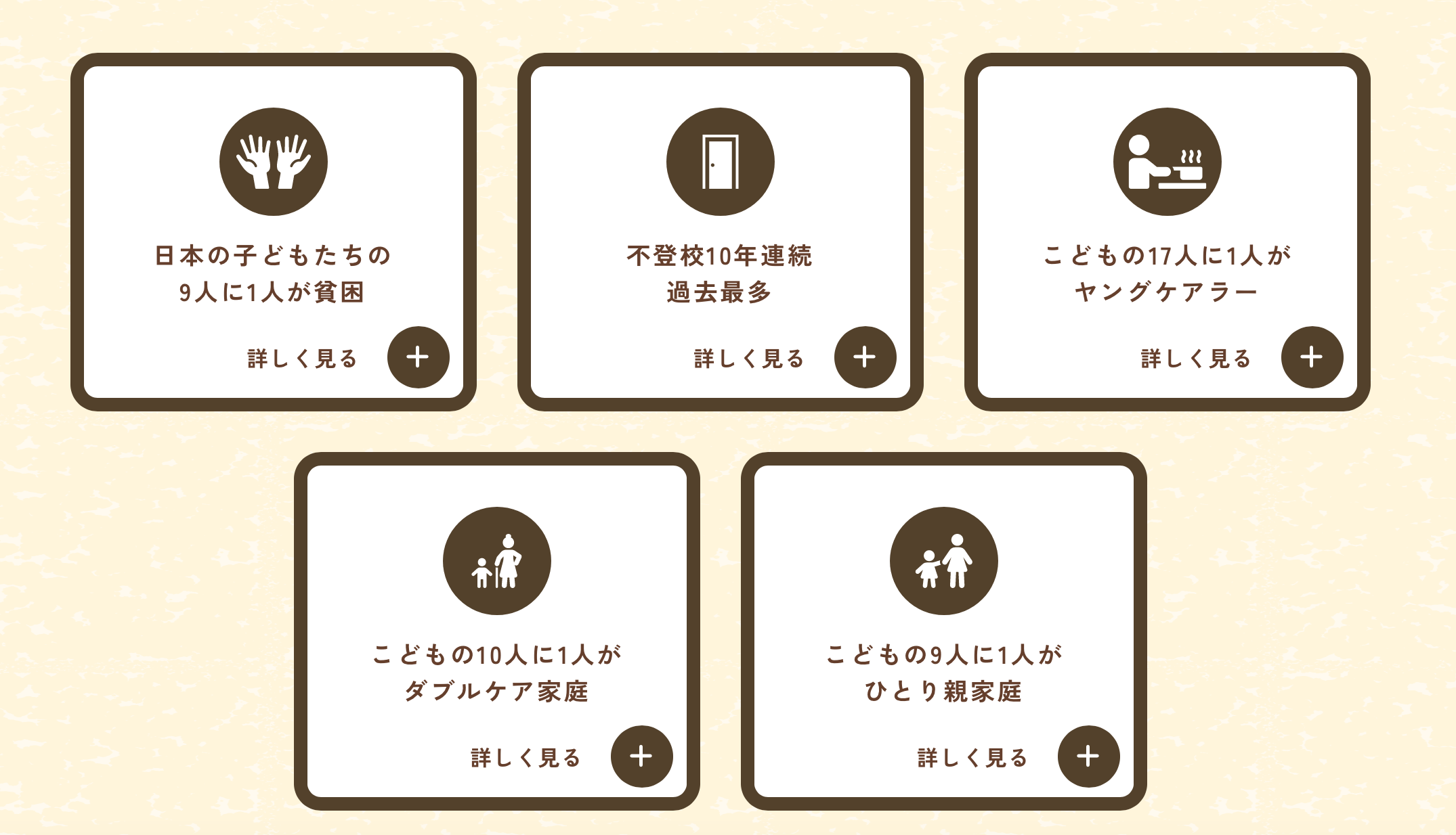 近年のこどもたちは、自殺・不登校・貧困の深刻化により、自己肯定感を育む体験機会の格差が生じています。また、ヤングケアラー・ひとり親・ダブルケアなど、こどもたちを取り巻く家庭環境に関する悩みは複合的に絡み合い、体験格差は深まっています。