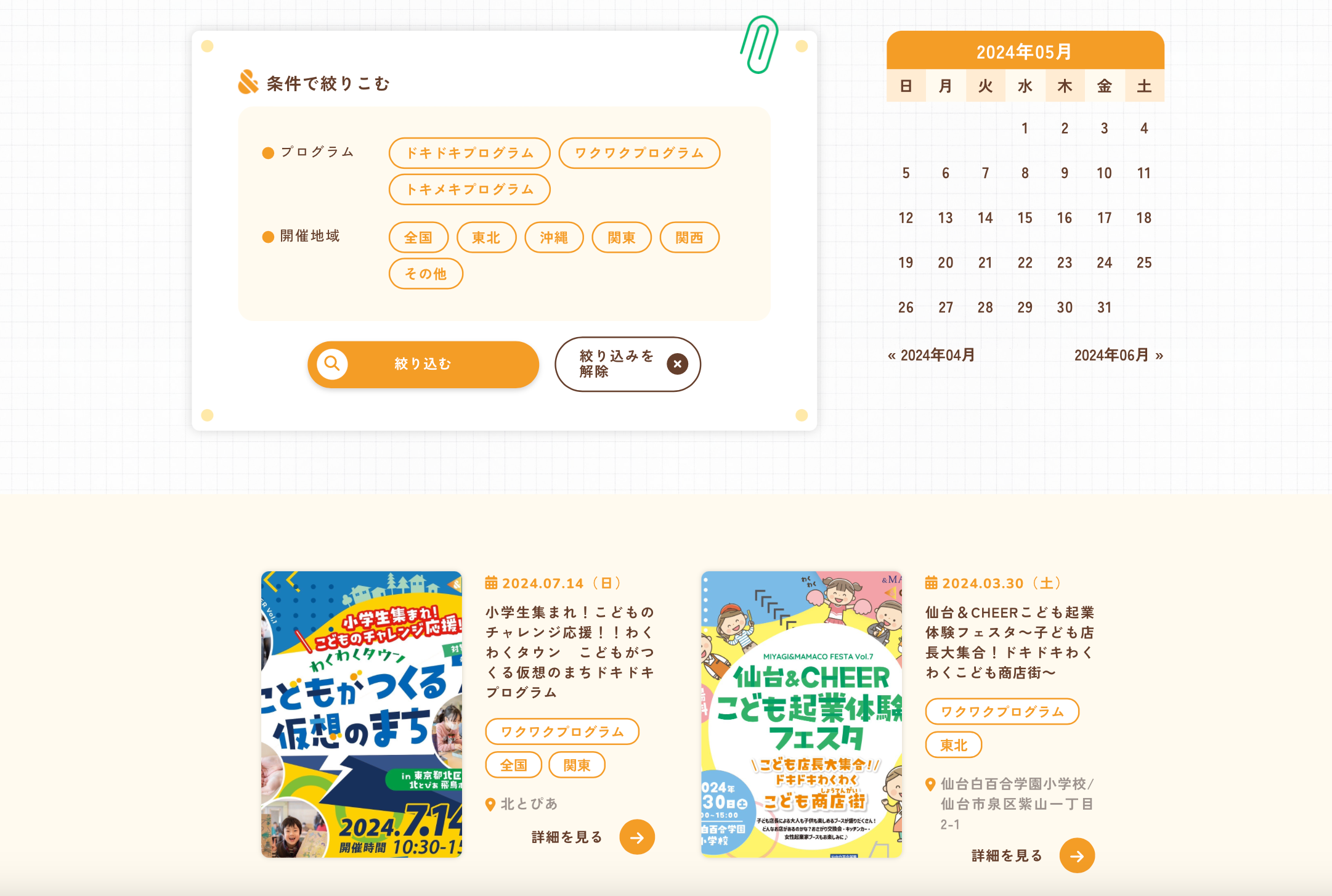 「プログラム種別」「開催地域」「開催日」ごとにイベント情報を検索できるイベント一覧ページを作成。気になるイベントを探しやすく、また申し込みまでオンラインで行うことが可能です。