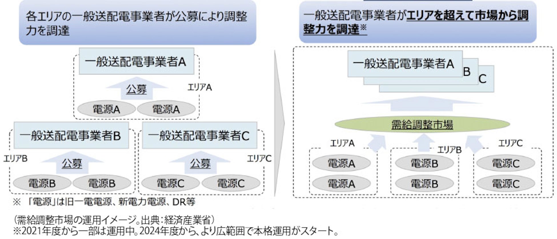 需給調整市場とは、電力需給のバランスを維持するための「調整力」を取引する市場です。特に供給量が変動しやすい再生可能エネルギーを拡大するためには、社会全体の調整力の流通が重要になります。海外では再生可能エネルギーの普及が進んでいますが、2021年2月には、米国テキサス州で寒波時の調整力不足によって380万戸を超える大規模停電が起きました。今後日本でも再生可能エネルギーの一層の普及を目指すにあたり、そのような事態を避けるため、これまで売買に規制が多かった調整力の流通を活発にしていく必要があります。そのため、地域や企業の垣根なく調整力を売買できる「需給調整市場」が、2024年4月から日本でも全面的に運用が開始されます。