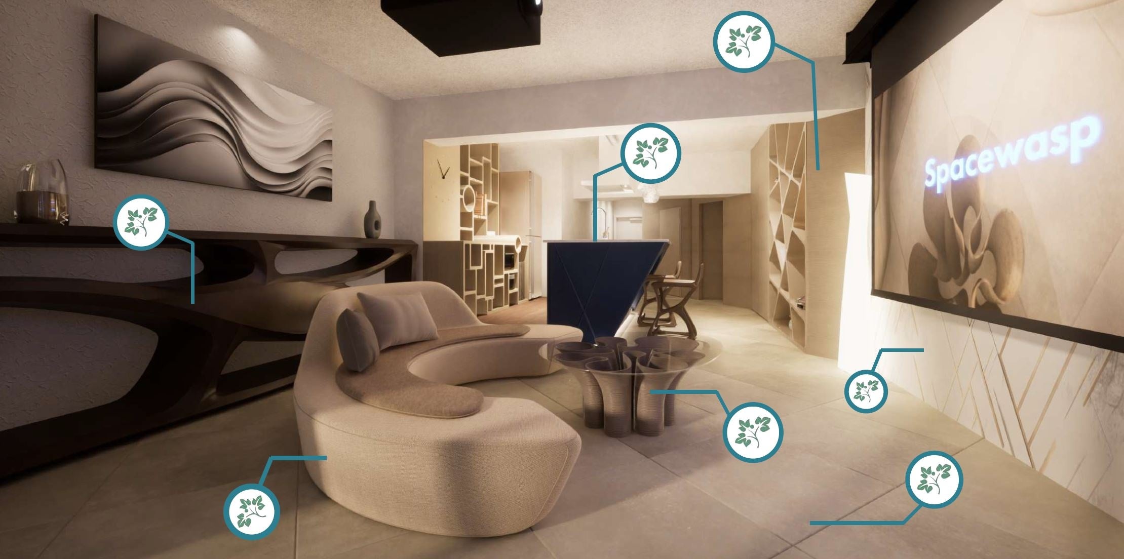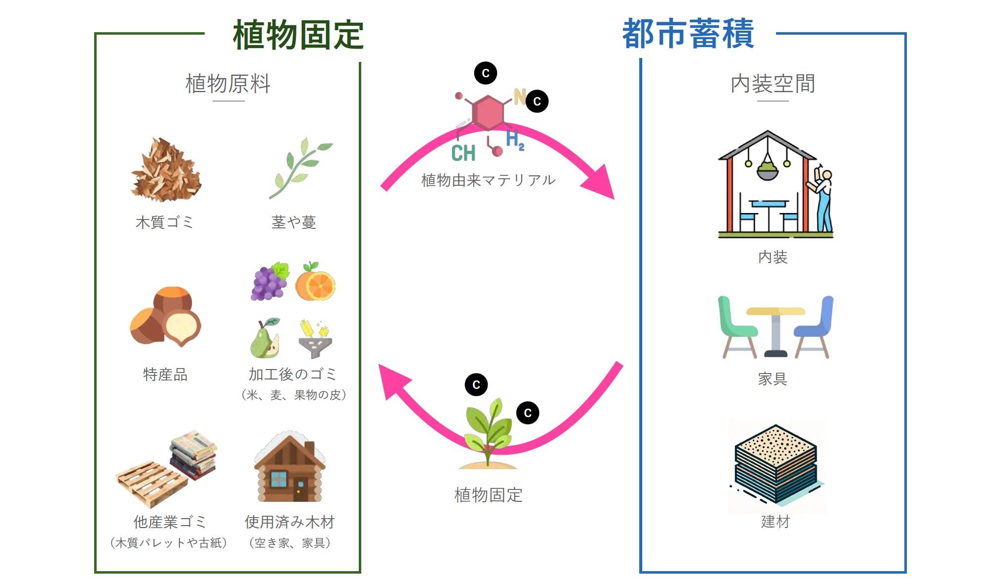 様々な産業から排出される植物廃棄物を原料に植物由来の内装空間(内装、ファニチャー、建材)を構築し、ホテル、カフェ、レストラン、オフィス、アパレル、住宅等、内装空間が事業に必須な事業者に対し、「サステナブルな素材で、いつでも、リーズナブルに、早く、新しいデザインの内装」が作れるサービスを提供します。先端技術を用いたDX(デジタル・トランスフォーメーション)と、サステナブルな素材を用いるSX(サステナビリティ・トランスフォーメーション)を組み合わせることで、新たな空間の購入体験を提供しつつ、スクラップ&ビルドでないサーキュラーな内装空間へ変換することで、サステナブルな未来を加速していきます。