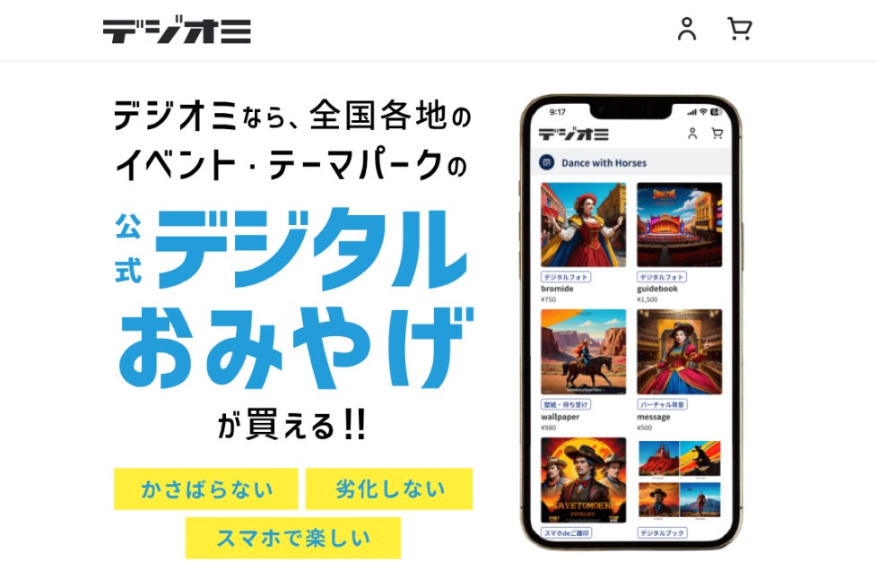 デジオミは、全国各地のイベント・テーマパーク施設のデジタルおみやげをスマホで簡単に購入・保存できる、日本初のデジタルおみやげ専門のECモールです。
