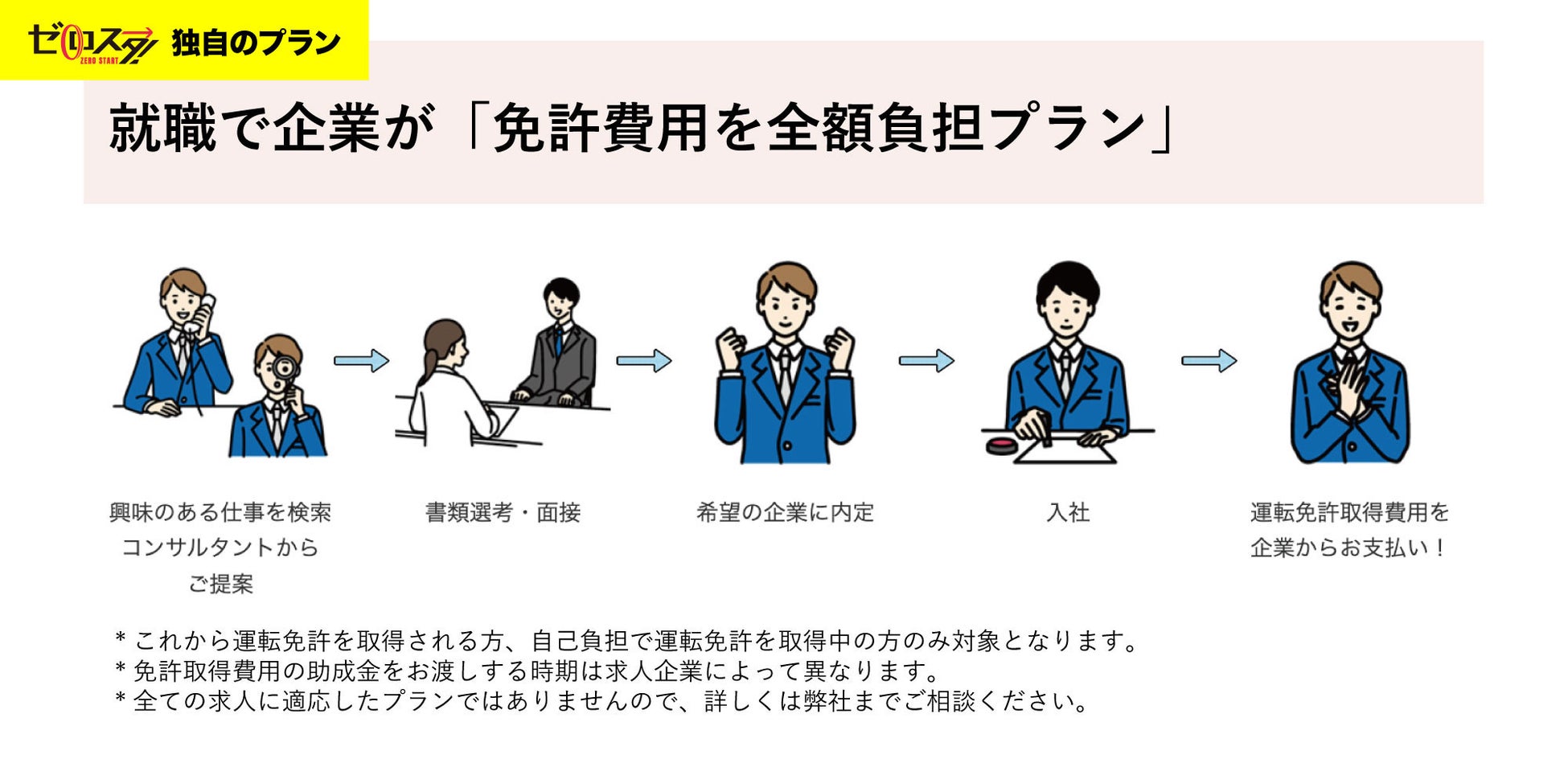 「ゼロスタ!」では、運転免許を取得予定のお客様、運転免許取得中のお客様を対象に本プラン対象企業に就職すれば、就職先企業が運転免許の取得費用を全額負担するプランもご用意しています。