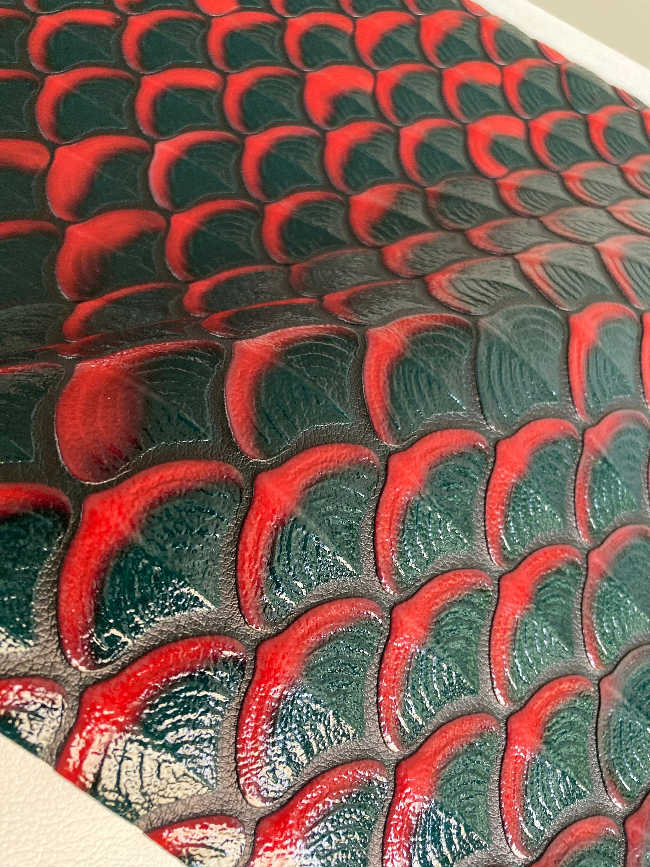 また人工皮革の上にプリントを重ねることで表面の凹凸をさらに深くしたリアルなフェイクレザーを再現します。この2.5Dプリント技術により、生物の鱗などの表皮を立体的に再現可能で、空想上の生物だけでなく、植物・イラストなどありとあらゆるもののフェイクレザーを製造することが可能です。