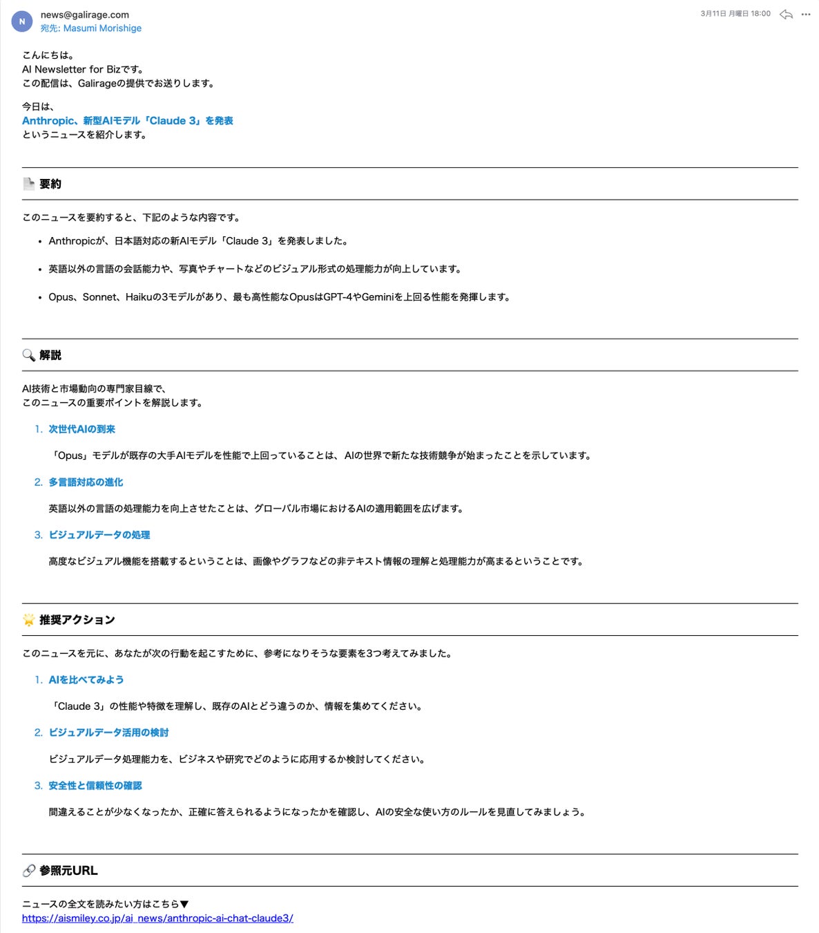生成AIに特化したシステム開発会社である株式会社Galirage(本社:神奈川県川崎市、代表取締役:森重真純、以下 Galirage)は、ビジネスパーソン向けに「AIニュース」をオーダーメイド配信するサービスである「AI Newsletter for Biz」を正式リリースしました。
