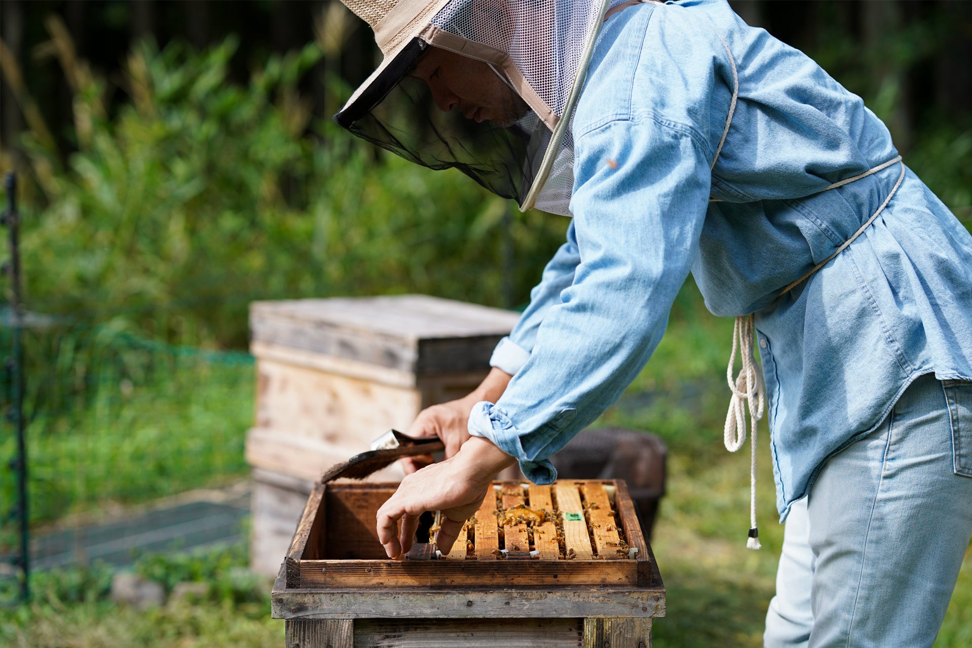 花の蜜が採れる地域環境を大事に考え巣箱を設置し、土壌と蜂による交配で森の維持に意識を向け、京都の山の自然保護に関与する。