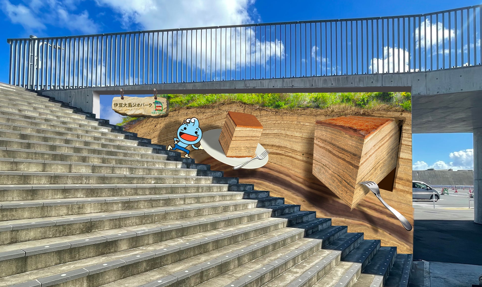 地層がバウムクーヘンに?伊豆大島ジオパークの大自然や文化をモチーフにしたトリックアート10作品が港でお出迎え
