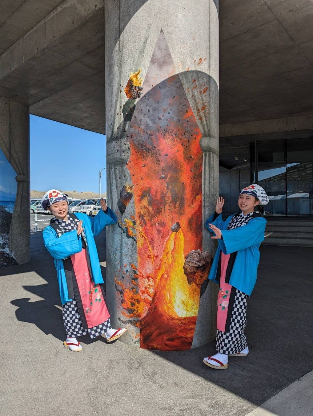 伊豆大島にお越しのお客様をお迎え・お見送りする岡田港船客待合所は、2019年に建てられたばかりの美しい曲線で構成された3階建てのコンクリート造りの建物です。そちらのエントランスにある巨大な4本の柱の両面にも、伊豆大島ジオパークの地域資源をテーマとしたトリックアートを8作品描きました。施設をご利用のお客様に自由に楽しんで頂けます。