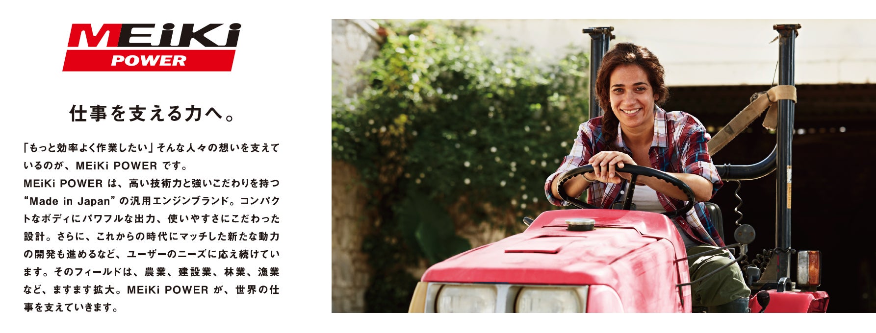 Willbeは、農業機械や建設機械などに使われるエンジンを主体とした汎用エンジンブランド「MEiKi POWER」に加え、発電機やポータブル電源などを主体としたライフラインブランド「Earth POWER」の2つの事業ブランドを持ちます。それぞれの価値を追求するとともに、両ブランドの相乗効果を発揮することで、日々の仕事を快適に、暮らしをゆたかに、そして人々の未来を動かしてまいります。