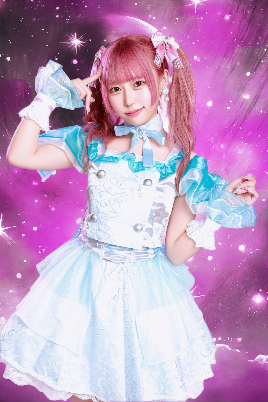 アイスブルー担当、ななせななです。レッスン中に親指の爪が吹き飛んだけれど、どうにか付けてもらったネイルと、こだわりをリクエストさせてもらった髪飾りが注目ポイントです!