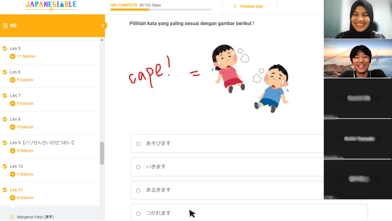 「JAPANESIABLE」では目的別に8つのクラスをご用意。日常会話ができるようになりたい初心者から、日本語能力試験の受験希望者、日本でのビジネスマナーを学びたい人まで、さまざまなニーズにお応えします。授業は「日本語が話せるインドネシア人講師」と「インドネシア語が話せる日本人講師」の2人体制で行います。また、授業の様子は録画し、何度も復習してもらえる仕組みです。おもな対象となる20~30代に受けてもらえるよう、価格は月額9ドル(約1350円)に設定しました。(写真:オンラインでの授業の様子・生徒名は伏せています)