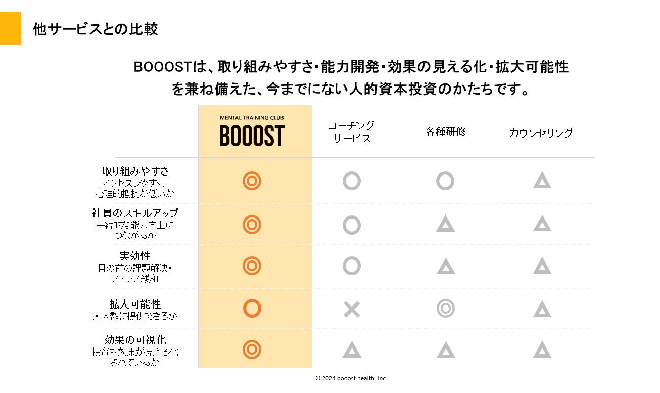 組織と個人の持続的成長を実現する伴走型トレーニングクラブ「BOOOST」は、企業のコア人材のエンゲージメント向上と不調・ネガティブ理由の離職防止を目指す、独自のプラットフォームです。キャリアデザイン・臨床医学・人材開発の専門家らと開発したデジタルツールとコーチによる伴走で、変革期・成長期の企業社員に必要とされる自己管理能力とストレスケアを実行支援します。大企業でのパイロット導入では、80%以上の満足度と顕著な行動変容、仕事への熱意の向上、ストレス対処スキルの改善が報告されています。人材・キャリア開発 x メンタルケアを融合させた新しい人的資本投資のかたちとして、企業と個人の持続的成長に貢献していきます。