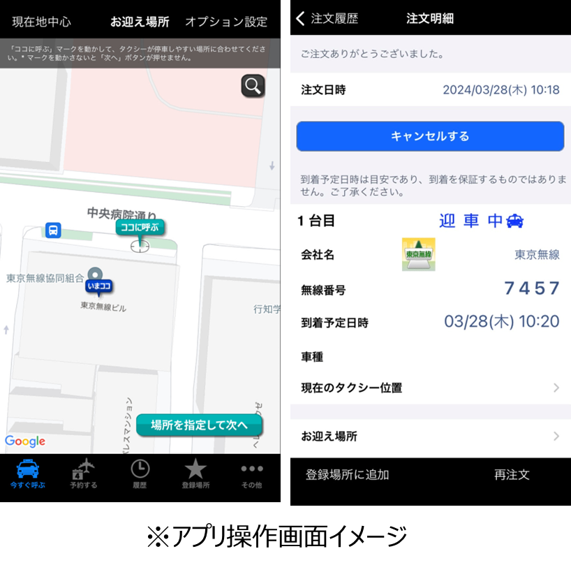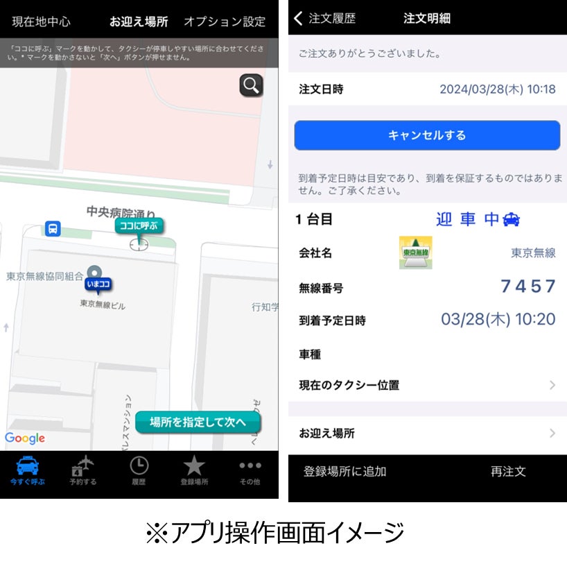 (日時・台数の指定予約、乗車位置のお気に入り登録、運賃検索機能などを完備)