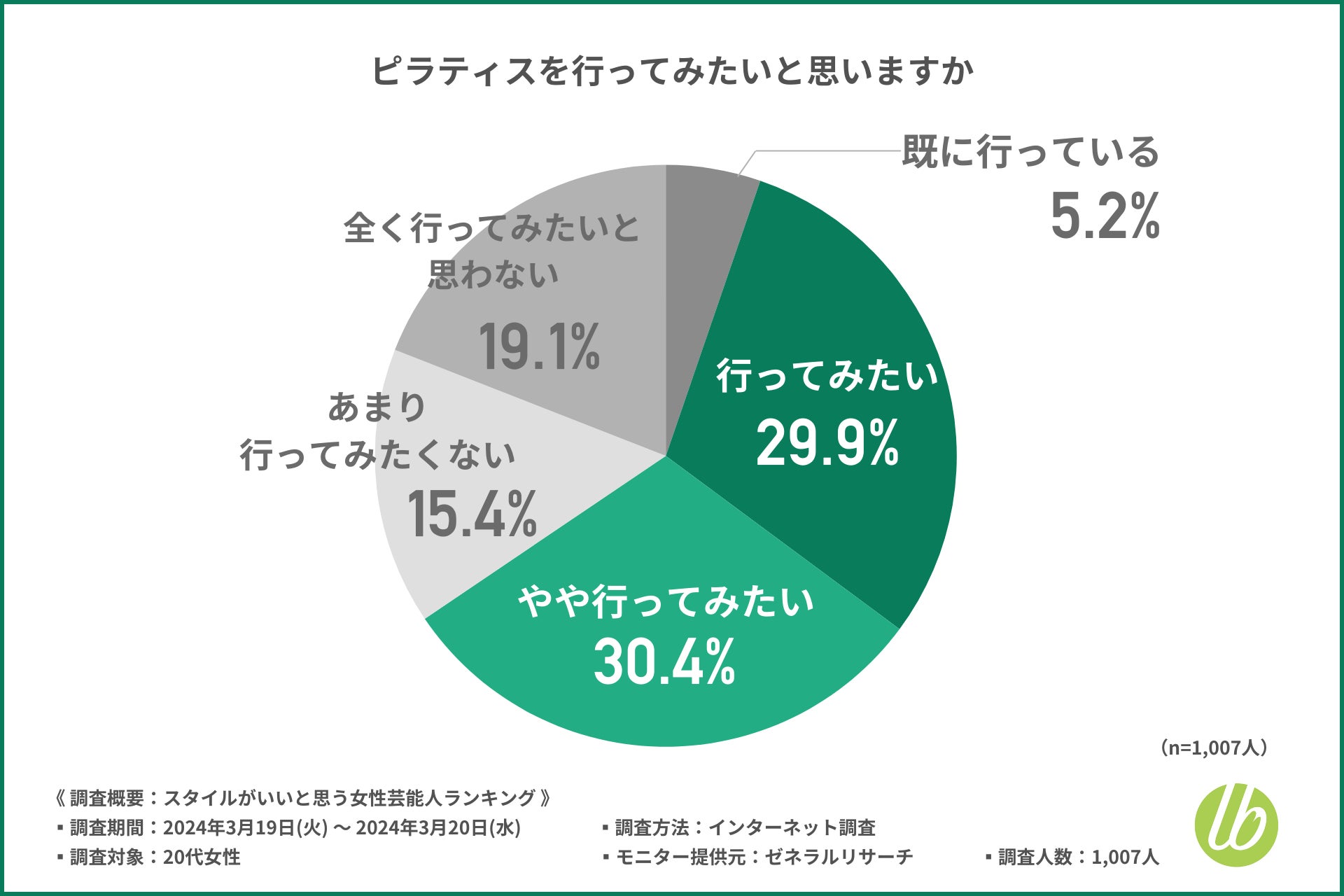 続いて、「ピラティスを行ってみたいと思いますか」と質問したところ、『既に行っている(5.2%)』『行ってみたい(29.9%)』『やや行ってみたい(30.4%)』『あまり行ってみたくない(15.4%)』『全く行ってみたいと思わない(19.1%)』という回答結果になりました。