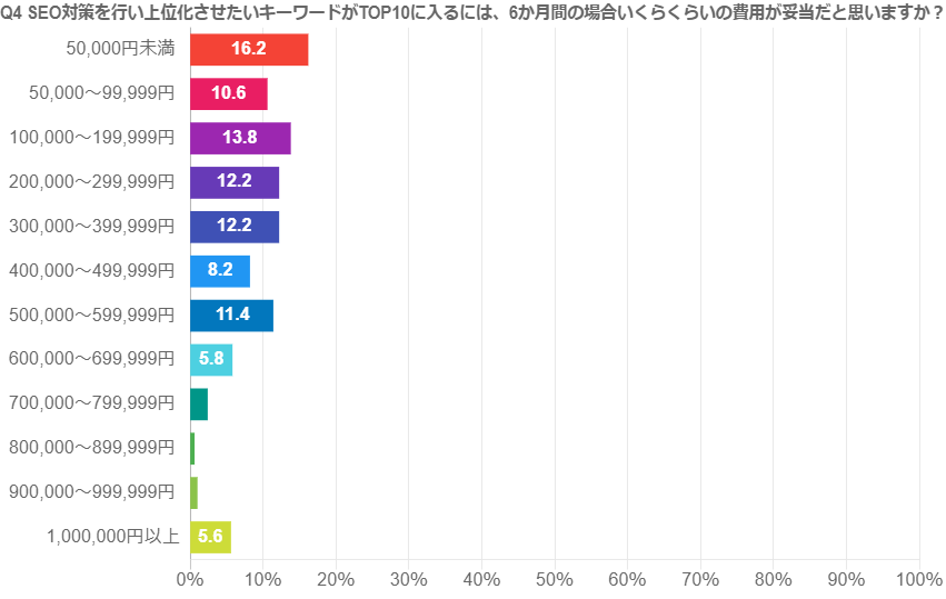 調査結果④ SEO対策を行い上位化させたいキーワードがTOP10に入るには、6か月間の場合だと月額でいくらくらいの費用が妥当だと思いますか?
