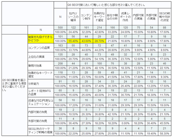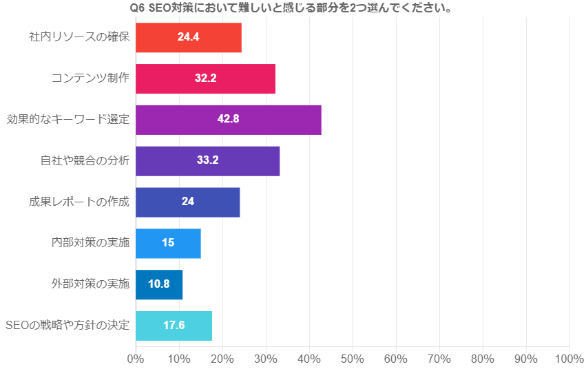 調査結果⑥ SEO対策において難しいと感じる部分を2つ選んでください。