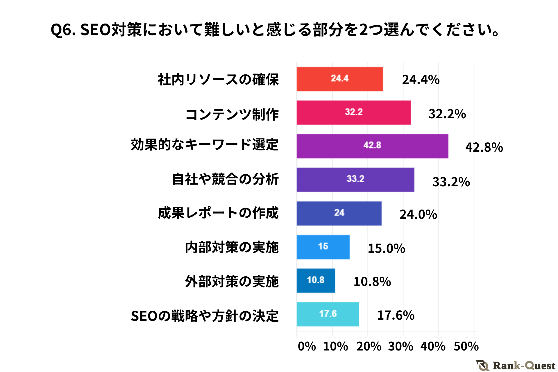「効果的なキーワード選定(42.8%)」や「自社や競合の分析(33.2%)」、「コンテンツ制作(32.2%)」などが、SEO対策の実務に関わる部分で特に難しいと感じられていることがわかりました。