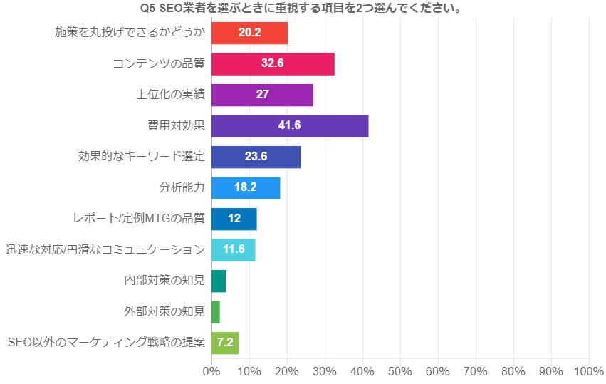 回答で最も多かったのは「費用対効果(41.6%)」、次いで「コンテンツの品質(32.6%)」と「上位化の実績(27.0%)」という結果となりました。ほかにも「効果的なキーワード選定(23.6%)」と「施策を丸投げできるかどうか(20.2%)」も一定数の方が重視していることが判明しました。