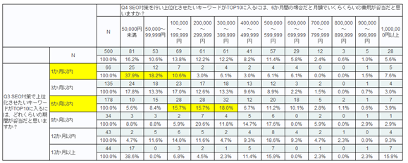 Q3(TOP10に入るには、どれくらいの期間が妥当だと思いますか?)で1か月以内での上位化を選んだ方は約50%が10万円未満、6か月以内での上位化を選んだ方は、30万円前後の金額が妥当だと考えている方が多いという結果になりました。 金額・期間の妥当性に対する考え方に一定の傾向があることが見てとれます。