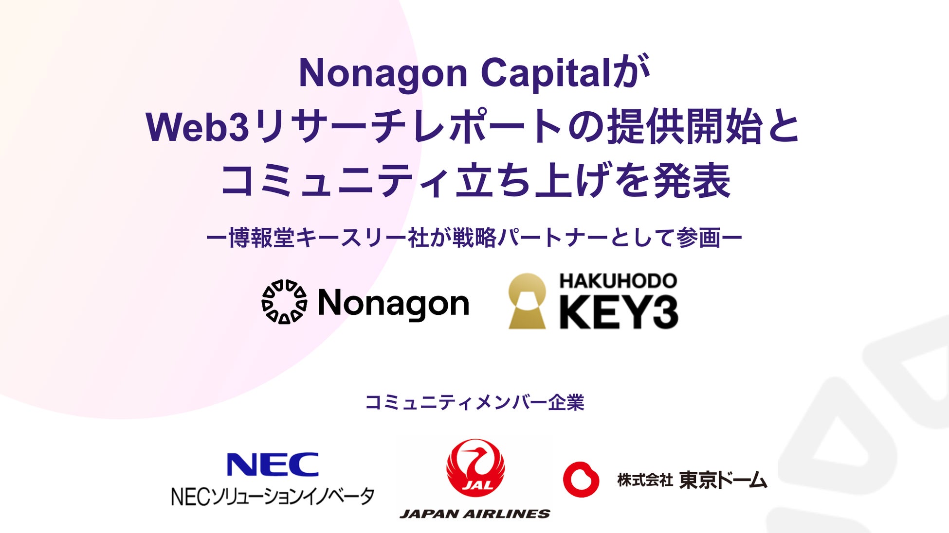 Nonagon Capital(本拠地:米国サンフランシスコ・ベイエリア、ファウンディング・パートナー:岡本 和士)は、国内企業におけるWeb3の最新情報キャッチアップや事業開発に貢献するため、Nonagon Report / Nonagon Connectの提供を開始することをお知らせいたします。本事業では、レポート提供やニュース配信、コミュニティ組成を通じ、CVCを含む国内大手企業のWeb3に関する理解とインプットを事業へと昇華させる過程に、貢献して参ります。株式会社博報堂キースリーが戦略的パートナーとして参画し、Web3への進出を検討している企業や既にWeb3領域へ進出している企業へのサービス提供を、ともに進めて参ります。