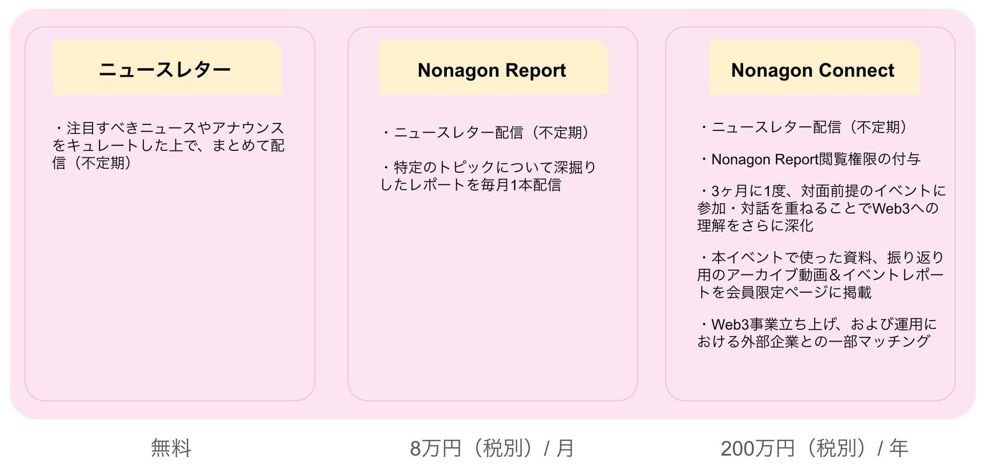 本事業が有料会員企業に提供するサービスは、月1本のNonagon Reportと、四半期に一度の対面イベントであるNonagon Connectの2つに分類されます。