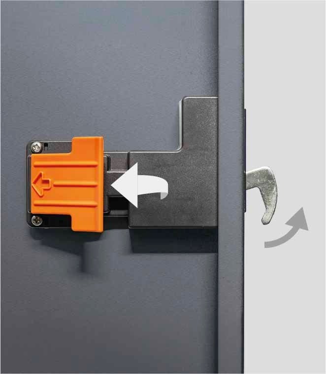新しい機能として、ハンドルはロック一体型となり仮ロック解錠と開閉を片手で行えます。また更なる安全性能として内側から「本ロック(本施錠)の解錠」もレバーひとつでできるようにしています。連動吊り戸式扉の上部は従来品の性能を踏襲しています。新しくなったのは扉下レールをなくしたことです。掃除の簡便性や凍結による地面の盛り上がりにも強くなりました。また、戸車の位置調整も扉を外すことなく庫内から調整が可能です。