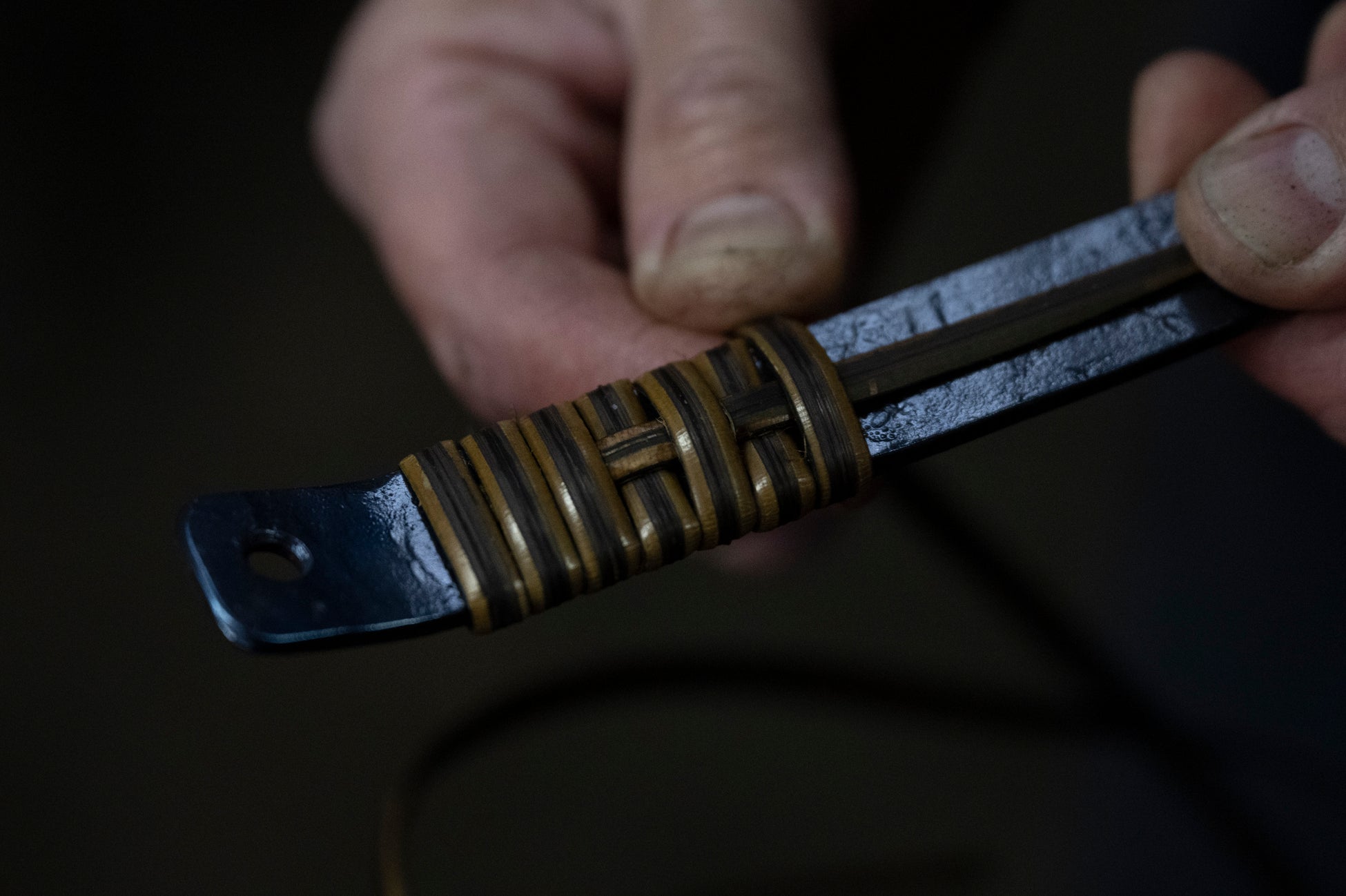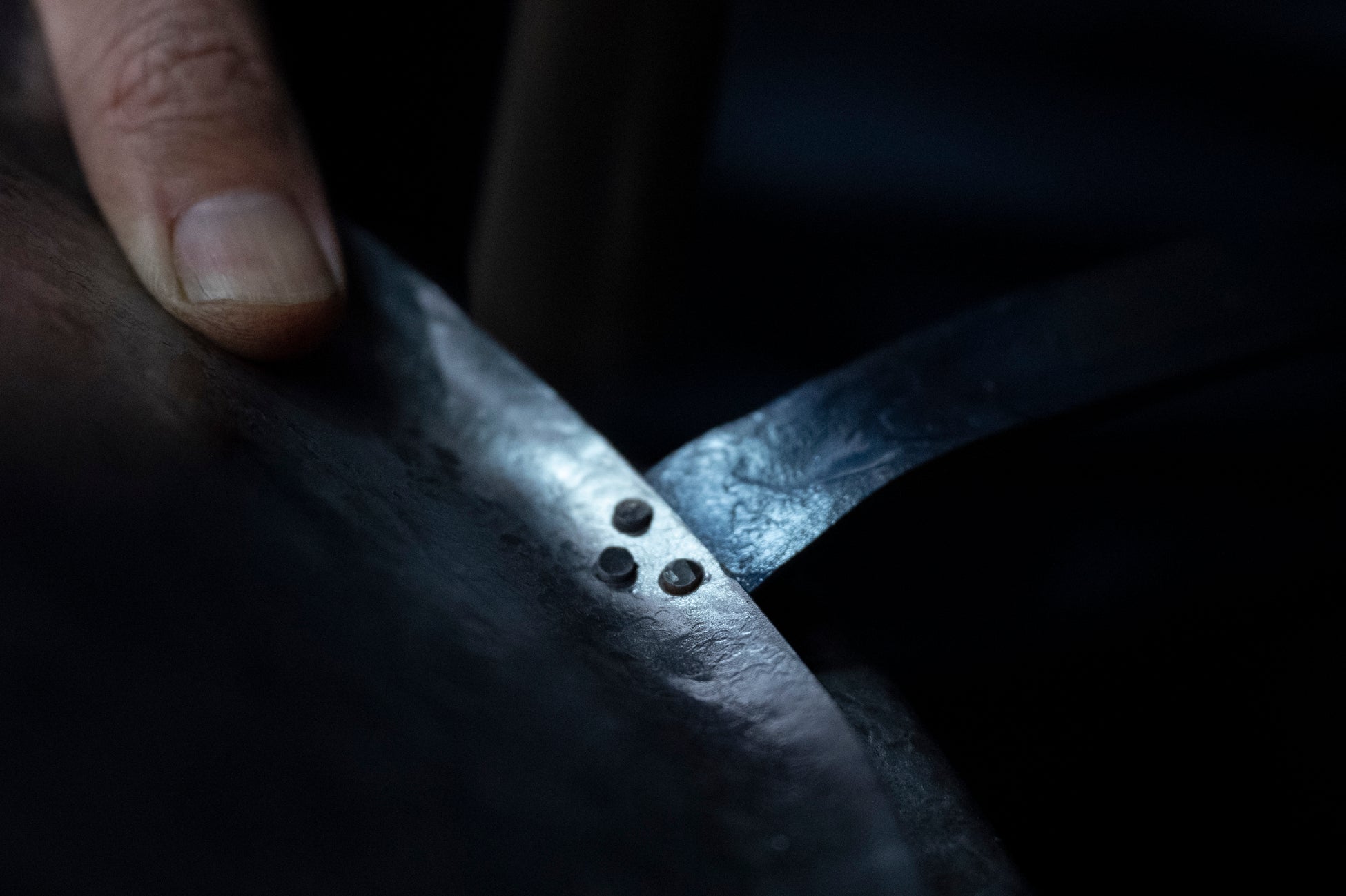 細部にも伝統的な技を落とし込みます。例えば、取手と本体を結合する手法。均一なプレス接合や溶接ではなく、作品ひとつひとつに合わせ伝統的な「かしめ留め」で繋いでいきます江戸時代から伝わる手作業でのたたき留めは熟練の職人だからこそ為せる技です。