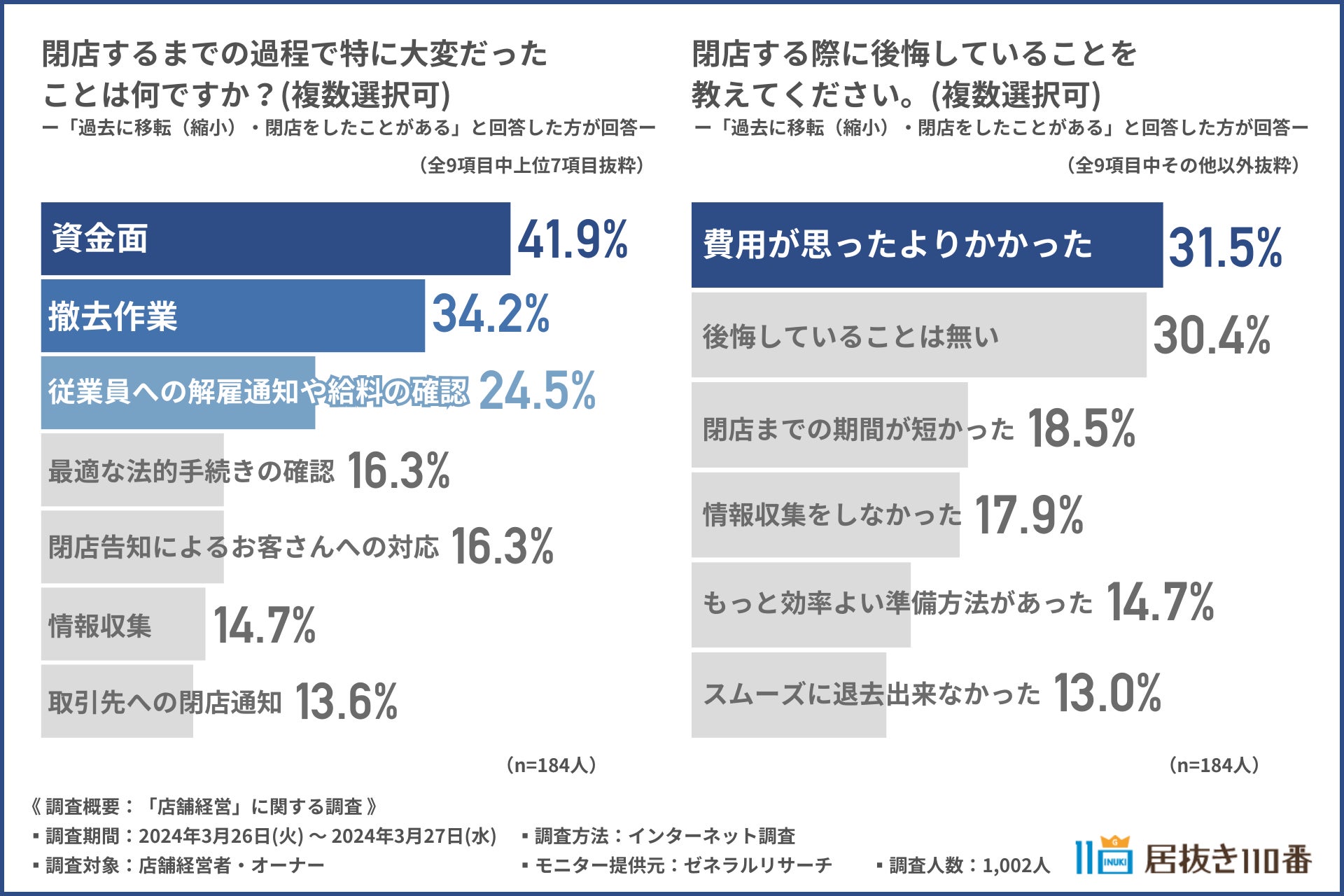 「閉店するまでの過程で特に大変だったことは何ですか?(複数選択可)」と質問したところ、『資金面(41.9%)』と回答した方が最も多く、次いで『撤去作業(34.2%)』『従業員への解雇通知や給料の確認(24.5%)』と続きました。