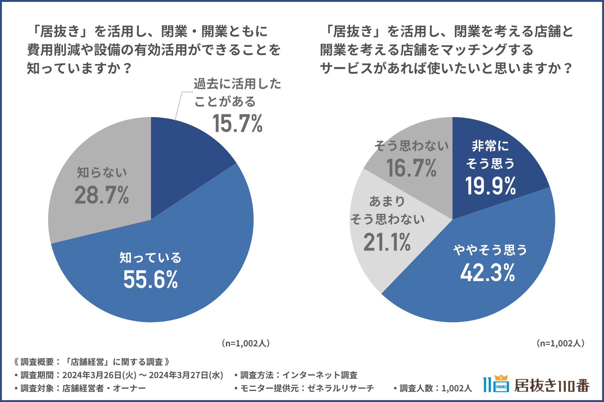 「居抜き」に関しては、約7割の店舗経営者・オーナーに認知されていることが示唆されました。居抜きを活用すれば閉業・開業ともに費用削減や設備の有効活用ができるため、店舗の開業や閉業を考えている方も多いのでしょう。