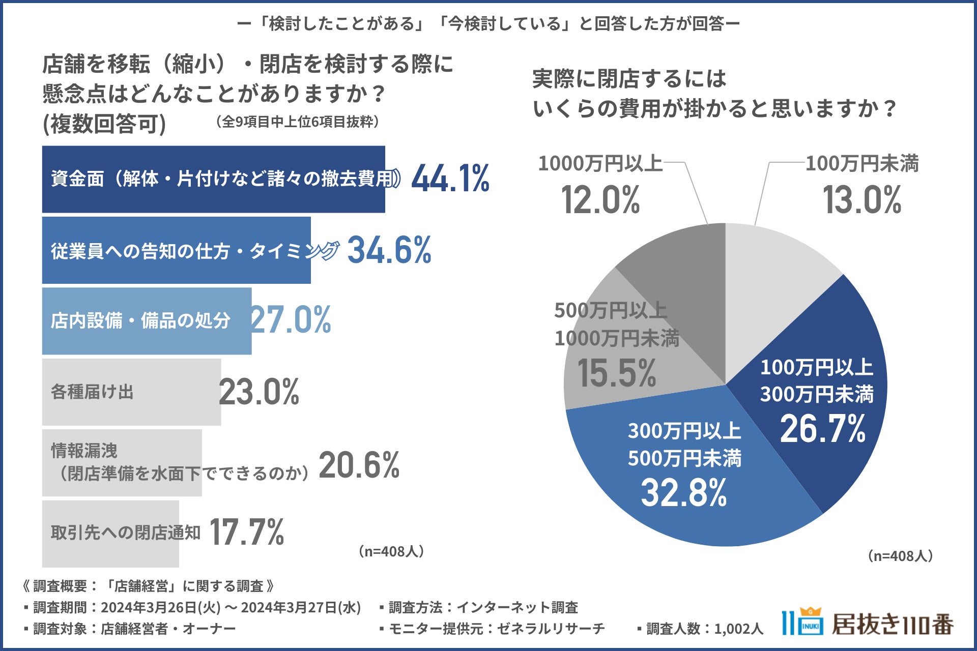 「店舗を移転(縮小)・閉店を検討する際に懸念点はどのようなことがありますか?(複数回答可)」と質問したところ、『資金面(解体・片付けなど諸々の撤去費用)(44.1%)』と回答した方が最も多く、次いで『従業員への告知の仕方・タイミング(34.6%)』『店内設備・備品の処分(27.0%)』と続きました。