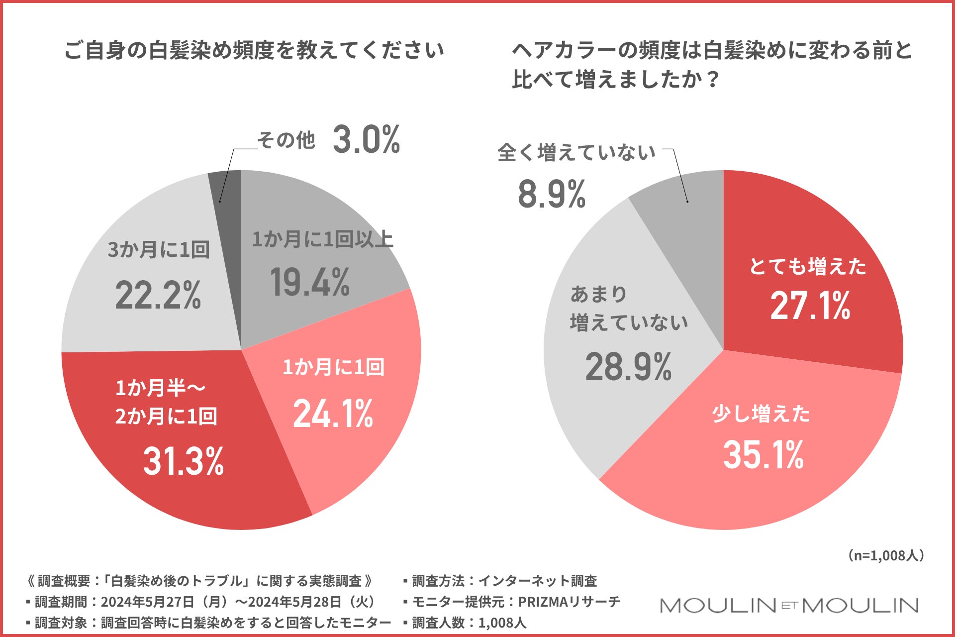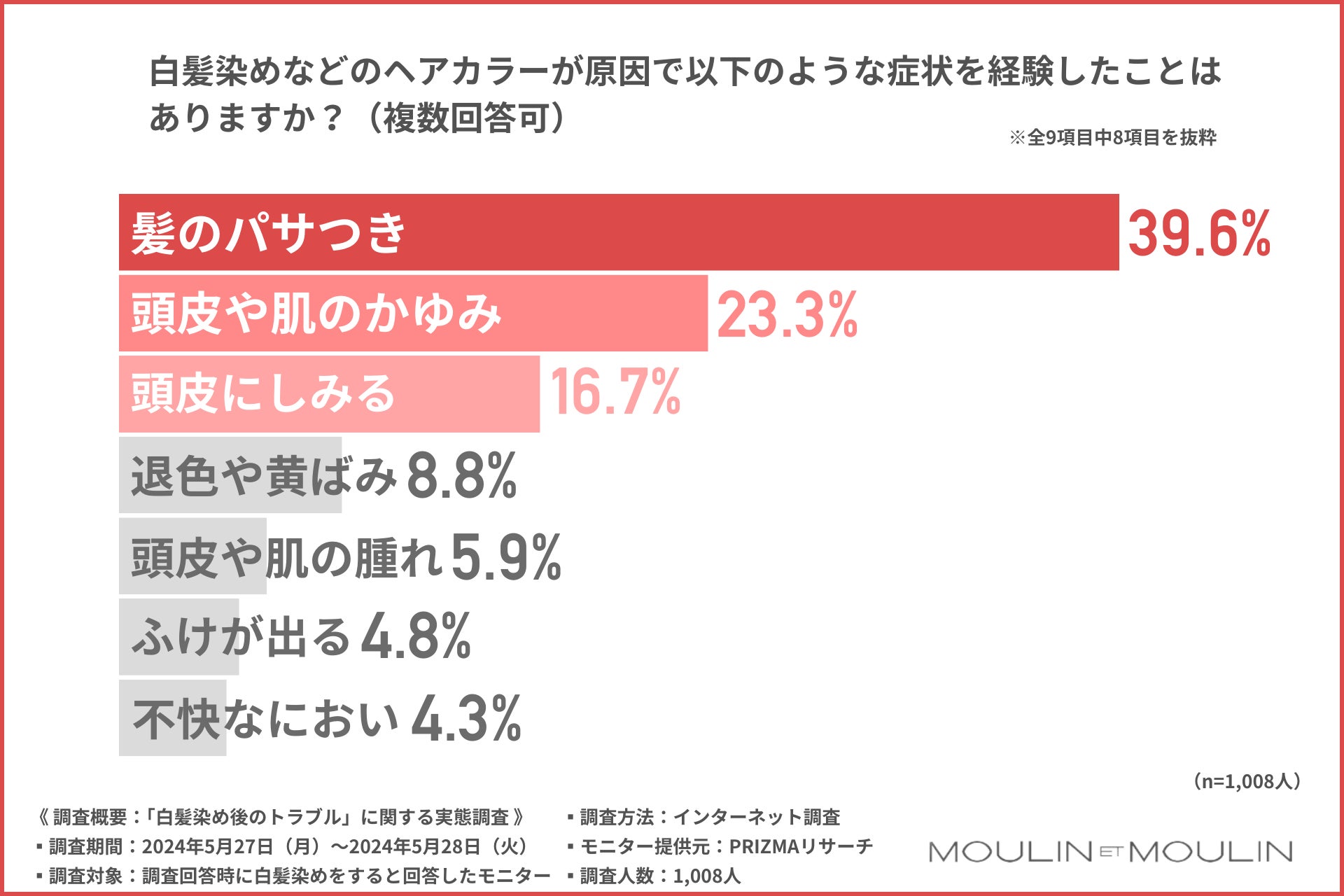 そこで今回、業務用美容関係商品の製造販売を手掛ける株式会社ムーランエムーラン(https://m-moulin.jp/)は、特に40代以上の白髪染めをする方を対象に「白髪染め後のトラブル」に関する実態調査を実施しました。