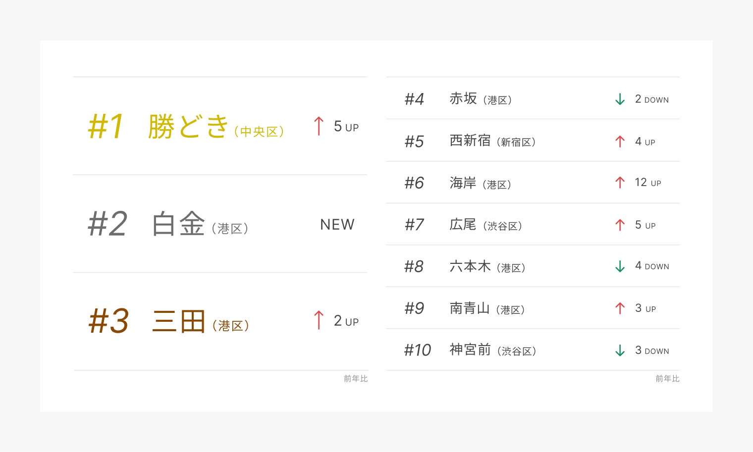 その他、4位「赤坂(港区)」、8位「六本木(港区)」、10位「神宮前(渋谷区)」は、4年連続で(※1)ベスト10入りしたことから、不動の人気を得ていることがわかります。