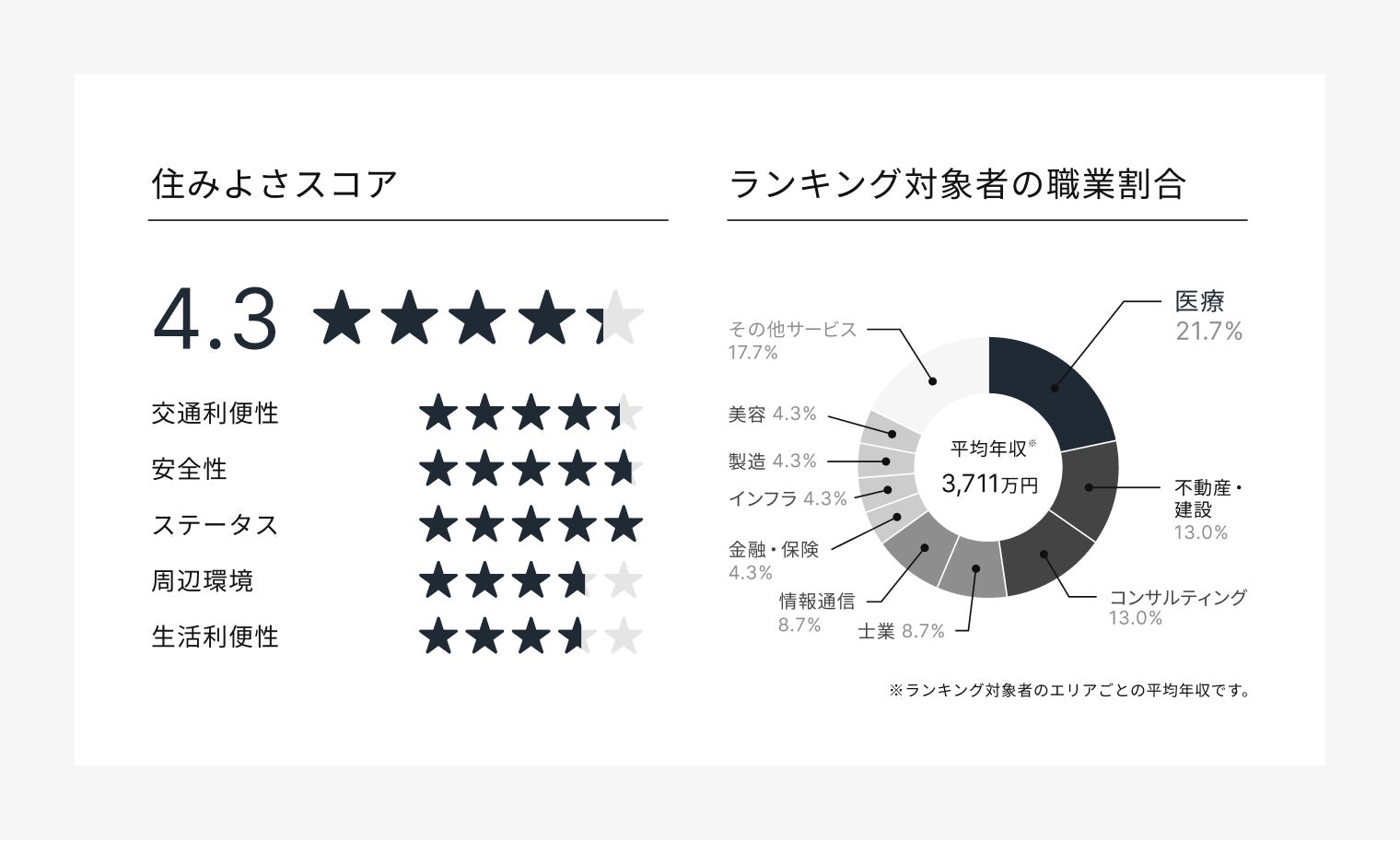 「住みたい街ランキング2024 by Modern Standard」の上位5つのエリアは、ランキング対象者のエリアごと平均年収、職業割合、住みよさスコアを調査しています。