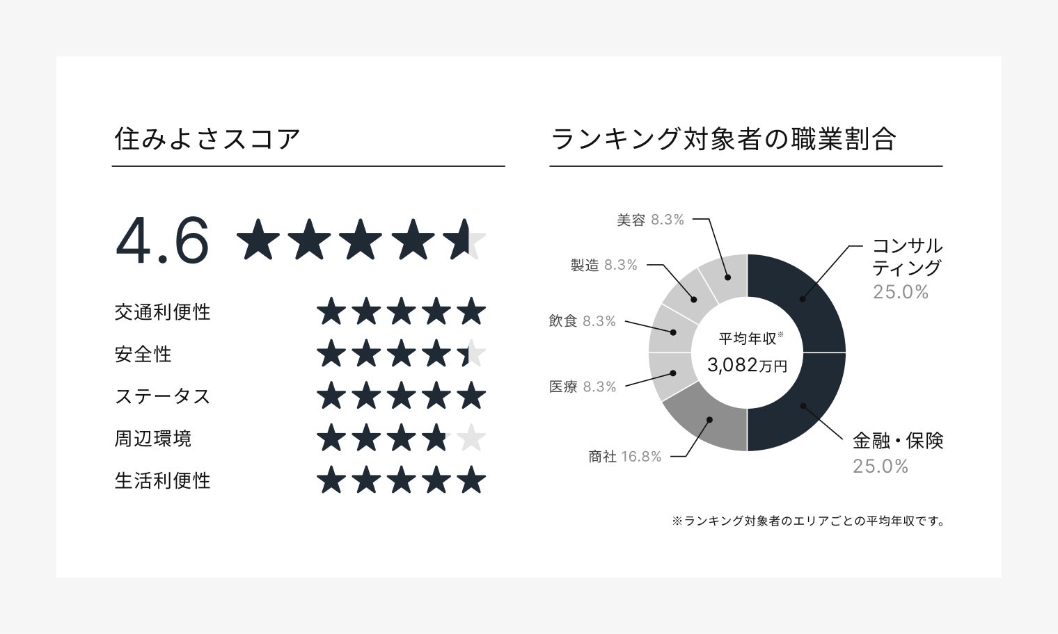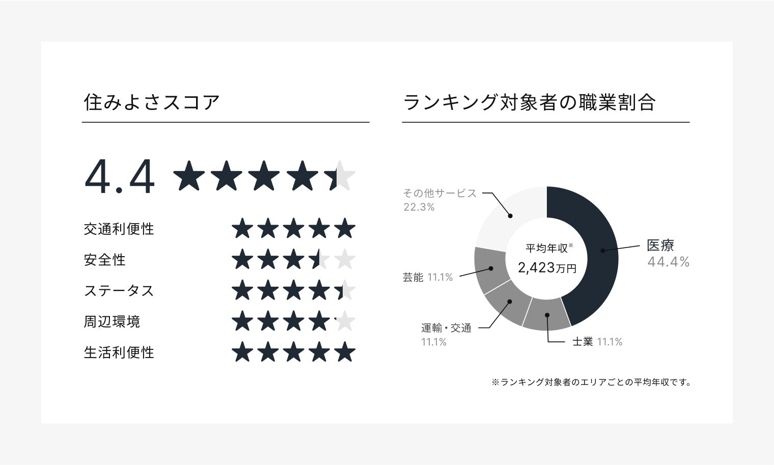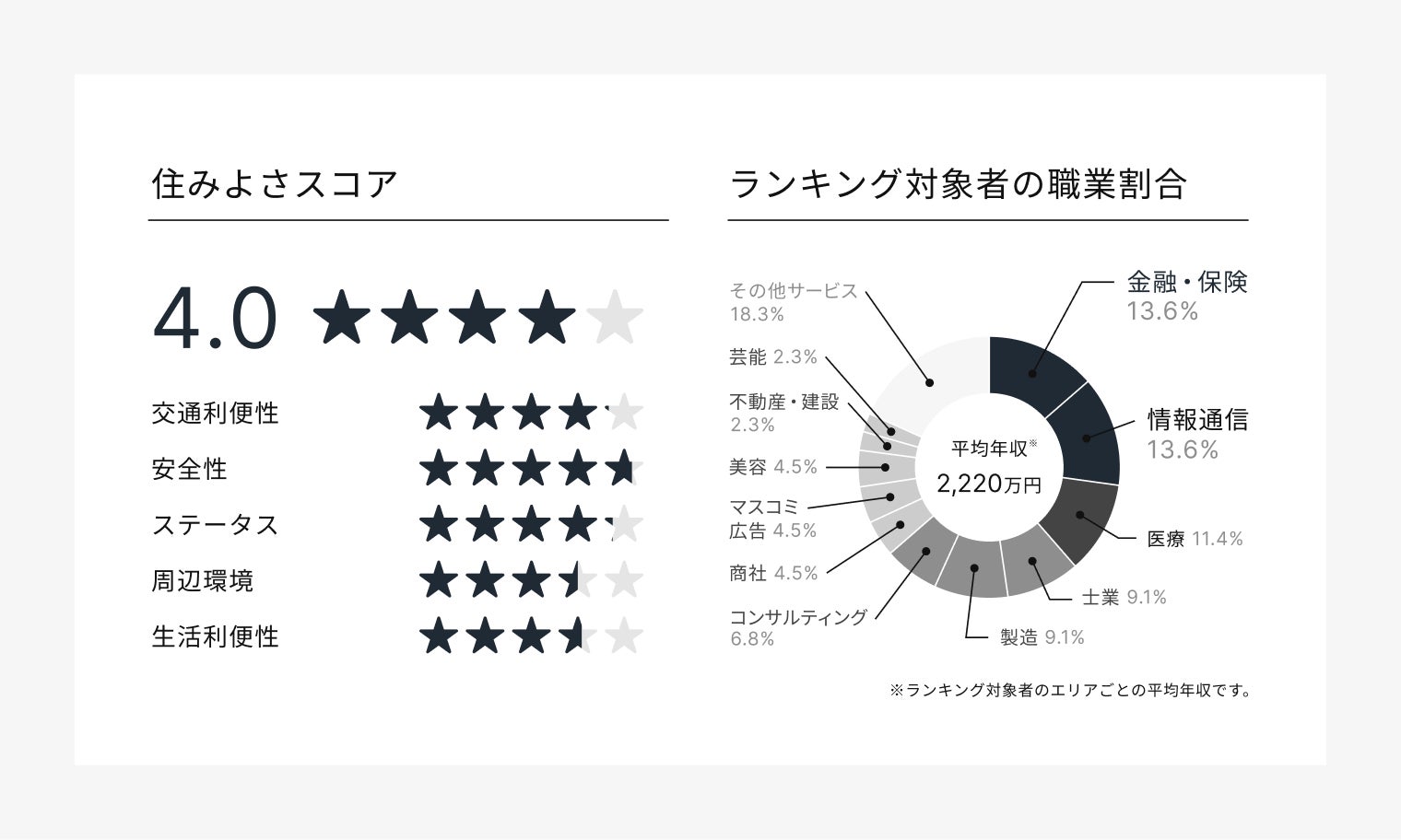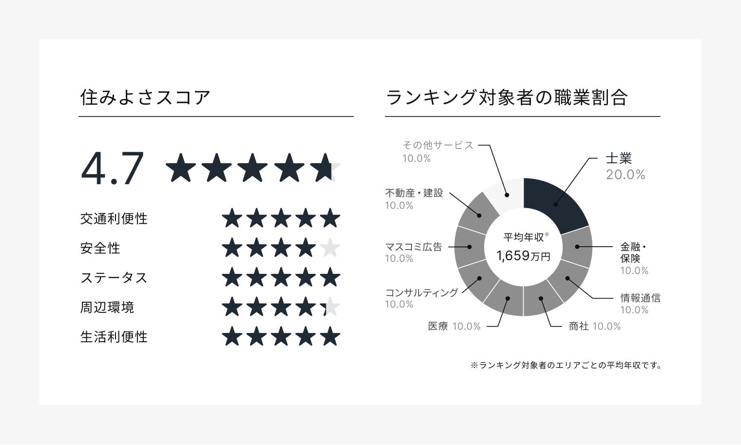 さらにベスト5に入ったエリアごとに、ランキング対象者の平均年収、住みよさスコア、職業割合も調査しています。