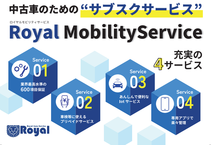 ロイヤルオートサービスは、「モビリティサービス創造企業」として、業界最高水準の600項目を高品質・長期間で保証するサブスクリプションサービス、専用デバイスを装着することにより、販売する中古車がIoTで繋がりアプリで管理可能な「Royal MobilityService」を提供します。