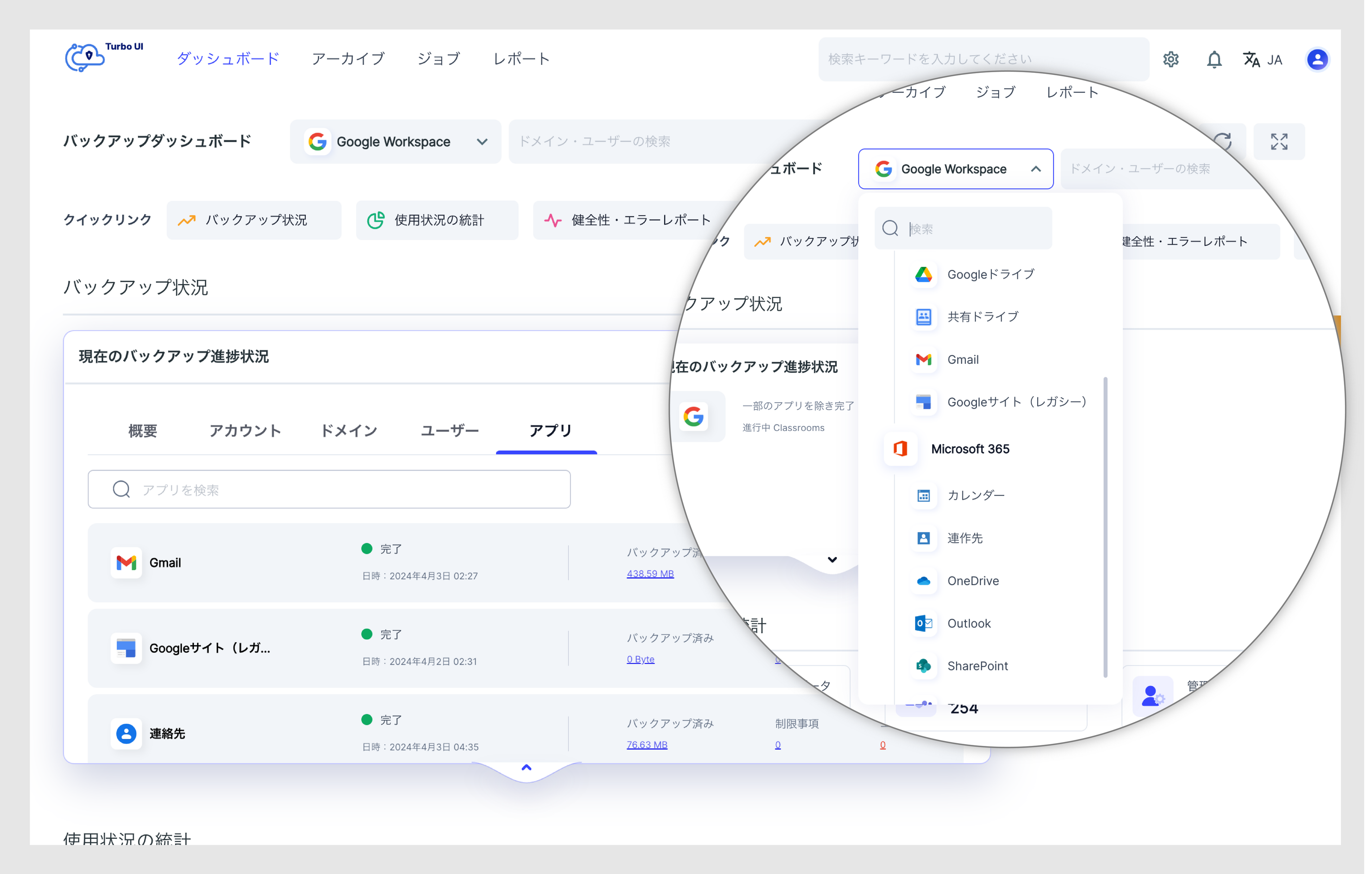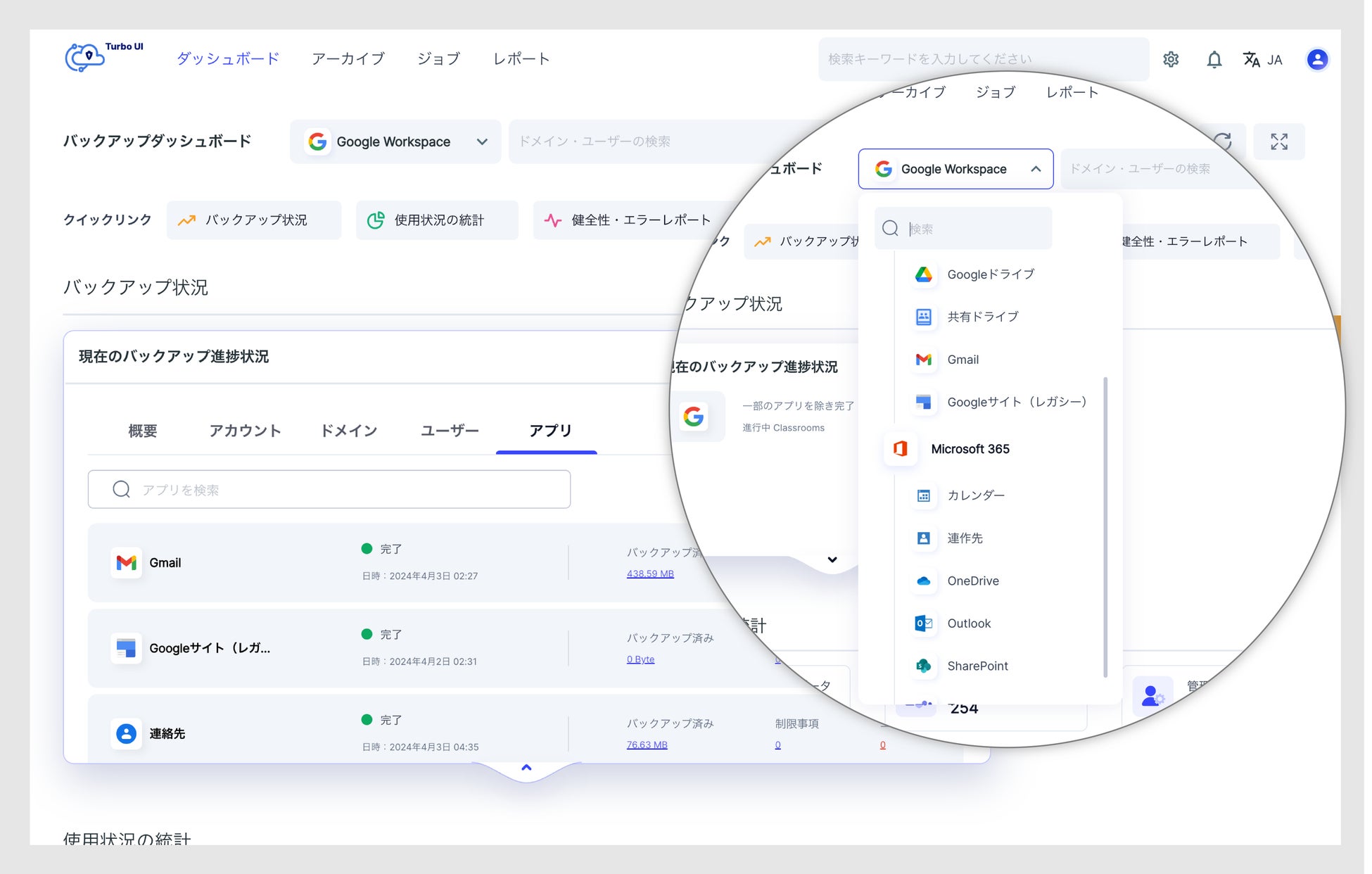 容量無制限のデータバックアップ機能や、ファイルの常時監視機能を備え、各SaaSアプリケーションのデータ・コンプライアンスをひとつのダッシュボードで管理することができます。