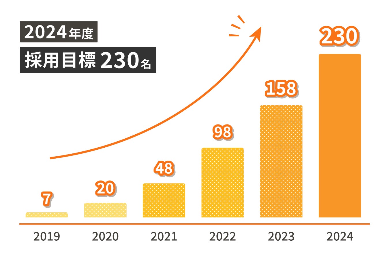 2024年4月現在、社員数は191名に拡大。2024年度は230名を目標に採用活動に取り組んでいます。