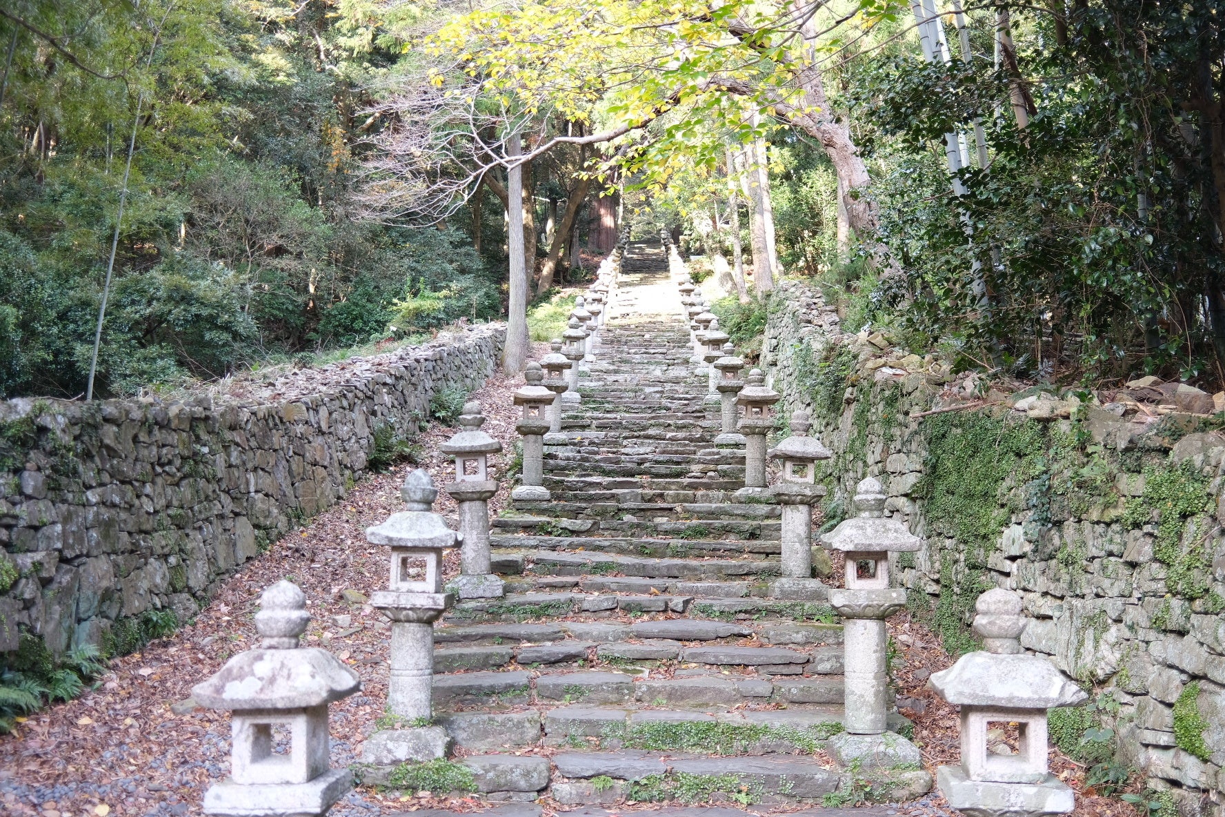 宗家対馬藩の菩提寺でもある万松院は、元和元年(1615年)に宗家20代義成が父義智の冥福を祈って創建した寺。数度の火災により焼失したため今の本堂は明治12年(1789)に建造されたものですが、安土桃山式の山門と仁王像は焼失から免れた対馬最古の建物で、堂内には朝鮮国王から贈られた三具足、徳川将軍の大位牌が現存しています。さらに132段の「百雁木」と言われる石段、宗家一族の墓所である御霊屋があり、巨大な墓がずらりと並び、荘厳な雰囲気が漂っています。そばには樹齢1200年と言われる万松院の大スギが3本あり、杉では対馬一の樹齢を誇っています。