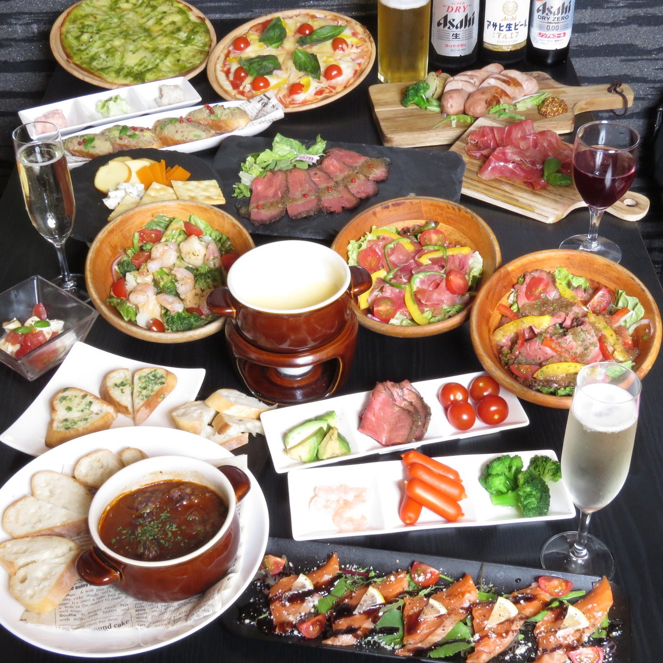 ワインに良く合う名物料理の「牛すじのデミグラス煮込み」を初め、豊富なバリエーションのサラダやローストビーフなど様々な料理で心とお腹を満たし自然と会話が生まれる、魅力的な空間を提供します。