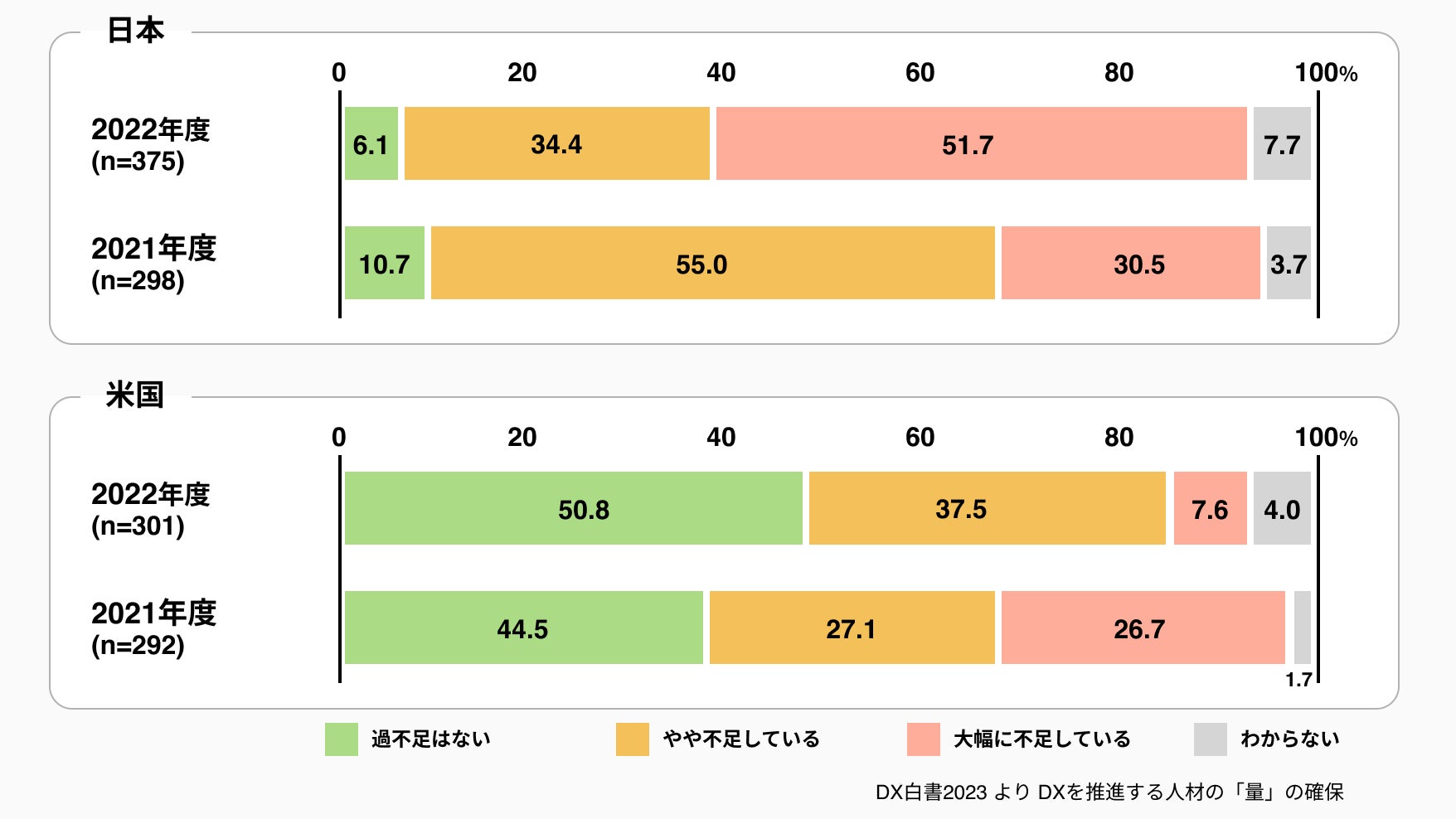 しかし、独立行政法人情報処理推進機構(IPA)の「DX白書2023」によると、DX推進のためのIT人材が「大幅に不足している」と回答した企業は51.7%とIT人材の不足が急務の課題であることがわかります。