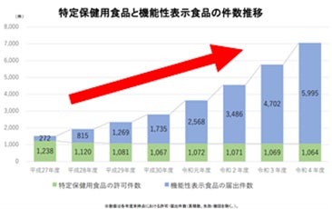 国の定めるルールに基づき、事業者が「食の安全性と機能性に関する科学的根拠」等の必要事項を販売前に消費者庁長官に届け出れば、機能性を表示することができる制度。2015年4月に「機能性食品表示制度」が開始され、世界で初めて「生鮮食品」においても表示が可能となりました。社会的にも健康志向の流れがある中、現在総届出数8157品(撤回を除くと6752品)、生鮮食品226品(撤回を除くと209品)【2024年3月末現在】。市場規模も2017年から2023年にかけて4倍に伸び、2023年の市場規模も6,865億円と前年比19.3%%の伸びを示し、コロナ渦以降の健康意識の高まりからも需要が伸びています。
