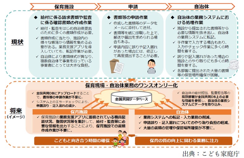 政府においては、保育現場や障害児支援現場におけるICT化推進事業の拡充を進めていますが、令和8年度の運用開始を目途に保育業務のワンスオンリー実現に向けた基盤整備を進めるとしており、給付・監査等の業務の標準化を進めるとともに、保育施設や自治体の業務システムと連携した全国共同データベースをガバメントクラウド上で稼働することを想定して共通システムの整備を目指しています。「登園キャッチ」では来るべく保育現場でのDXにいち早く対応し、簡易APIにてデータ連携ができるよう既に設計されており、保育現場や障害児支援現場での標準化・ワンスオンリー実現に貢献していく所存です。