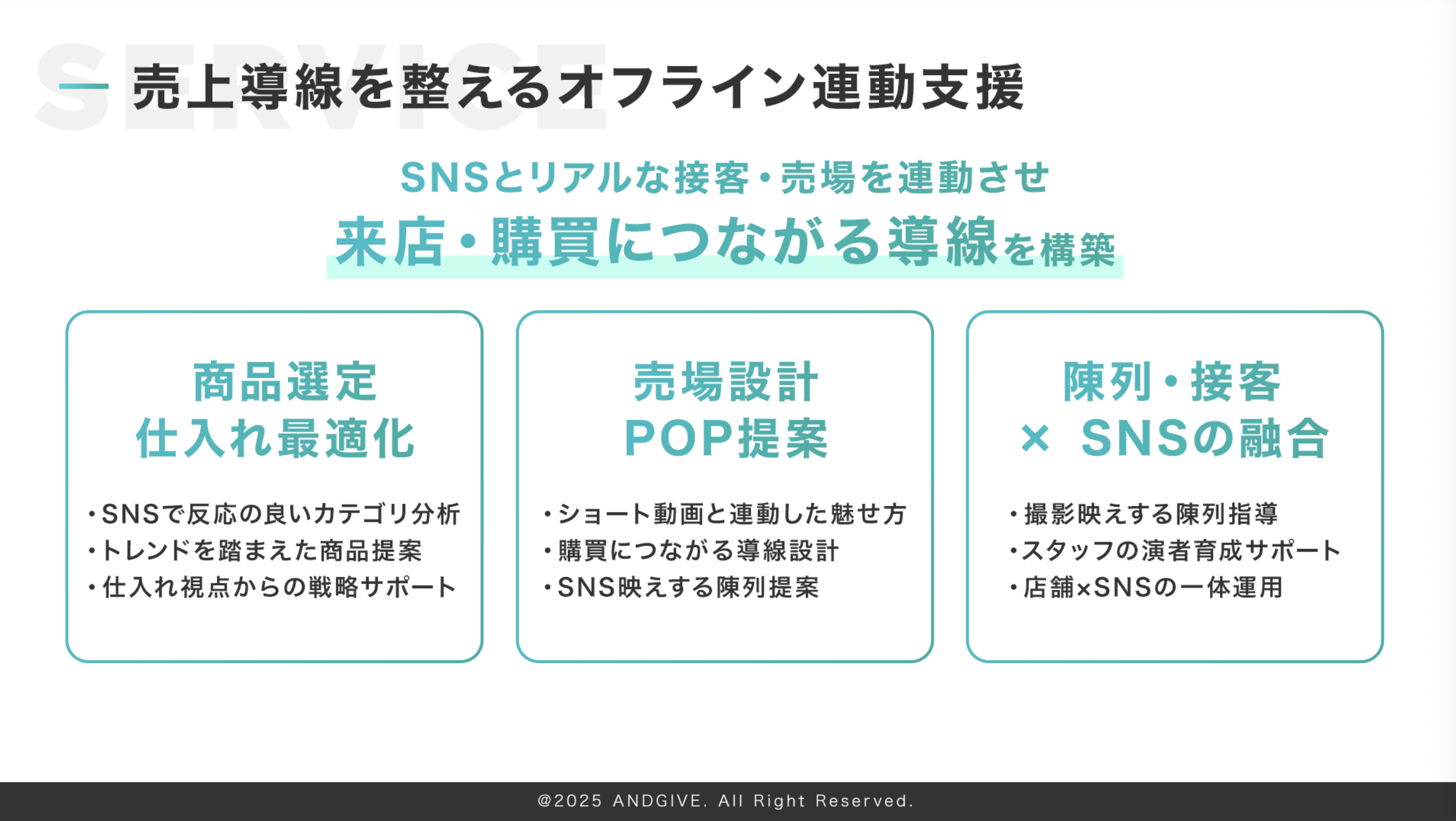株式会社ANDGIVEは、「私たちは“支援する会社”ではなく“一緒に売る会社”です」という理念のもと、小売・店舗ビジネスの成長をこれからも力強くサポートしてまいります。