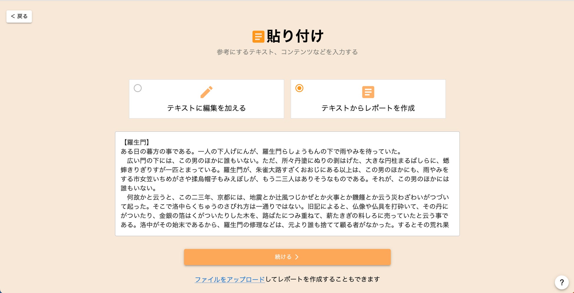 授業ファイルやテキストからレポート作成することが可能になりました。授業ファイルや授業のテキストをアップロードすることで、その内容からレポートを作成することができます。