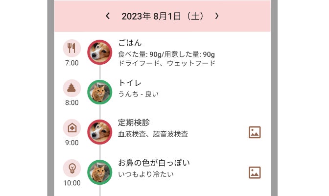 記録できるお世話内容はごはん、トイレ、体重、気になったこと、通院、投薬など6種類以上!写真の記録もできます。