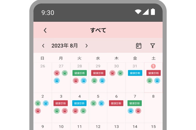 1ヶ月のお世話状況をひと目で確認できます。お世話内容別、うちのこ別と表示方法は自由!