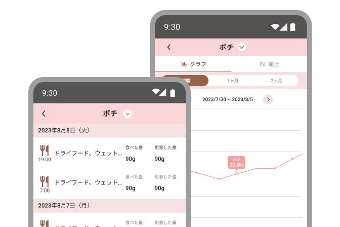 ごはんの量やトイレの状態を一覧で確認、体重の増減はグラフでわかりやすく!